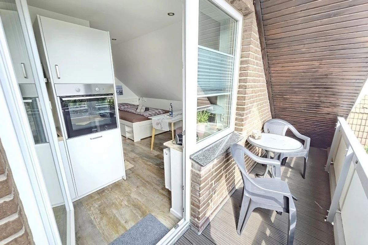Zum Appartement gehört ein einladender, überdachter Balkon, welchen Sie vom Wohn- und Schlafzimmer aus betreten können. Balkonstühle stehen zur Verfügung, so dass Sie ganz entspannt an der frischen Nordseeluft verweilen können.