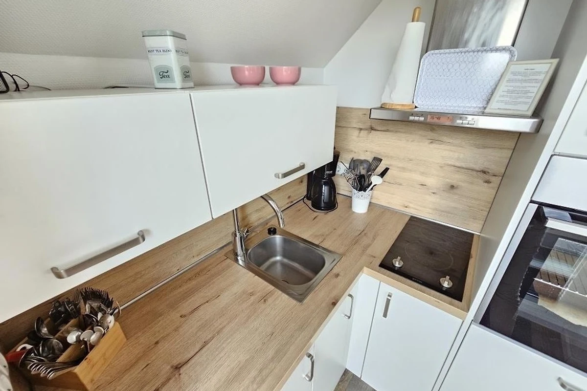 Die Küchenzeile bietet Ihnen ebenfalls viel Komfort auf kleinem Raum. Herd (mit zwei Platten), Backofen, Kühlschrank mit Gefrierfach und Spülmaschine stehen ebenso zur Verfügung wie Toaster, Wasserkocher und Kaffeemaschine. Auch Besteck, Geschirr und Küchenutensilien fehlen nicht, so dass eine sorgenfreie Selbstversorgung möglich ist.