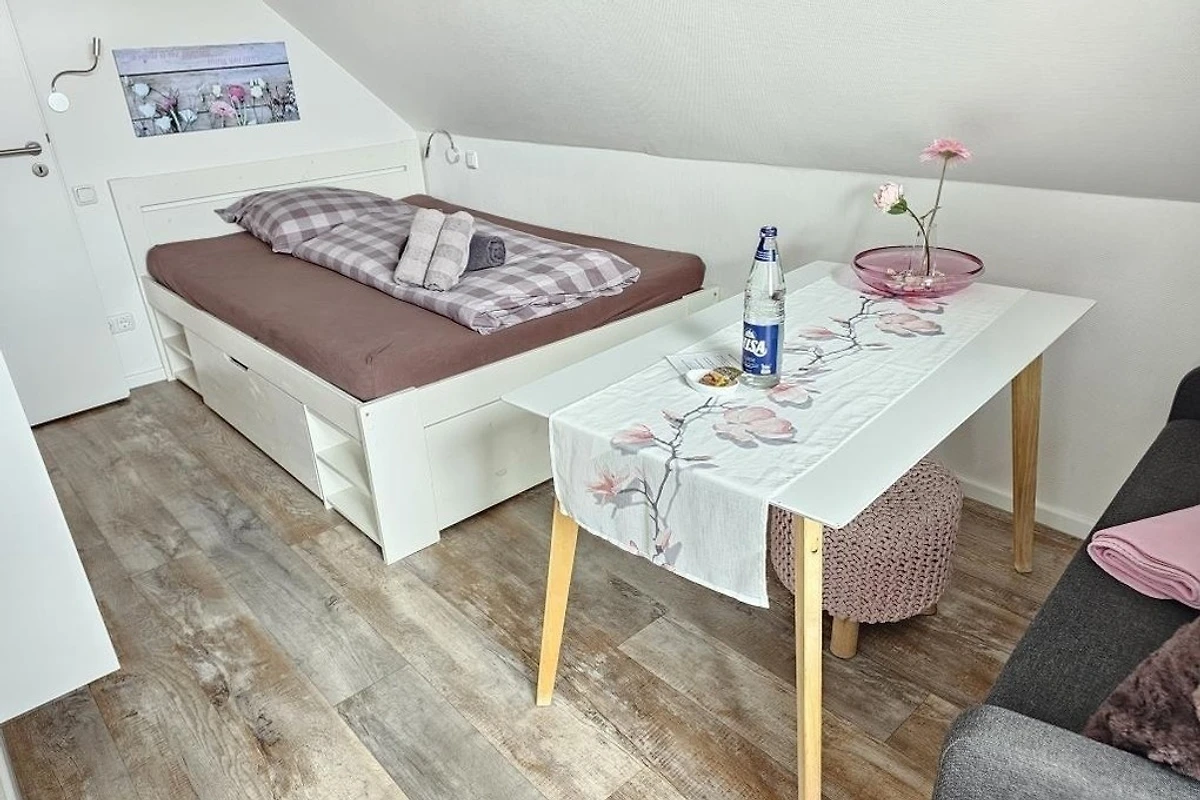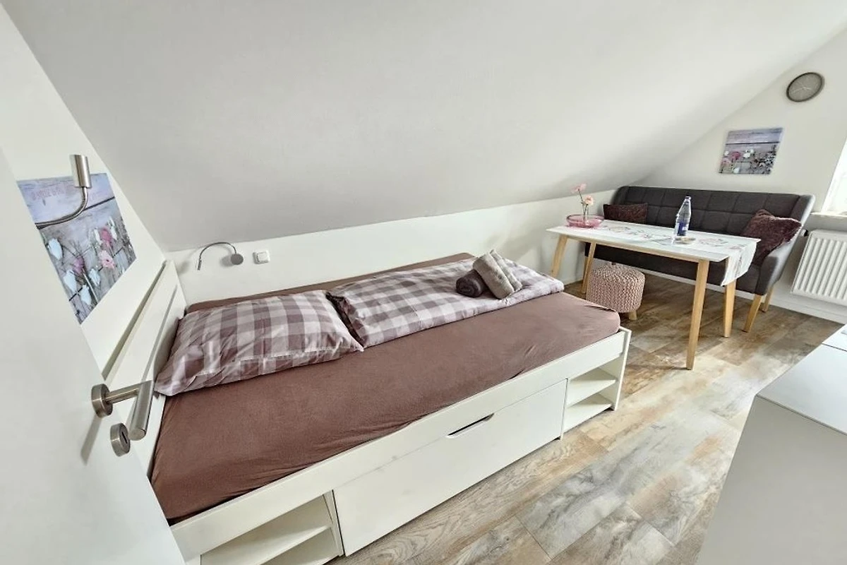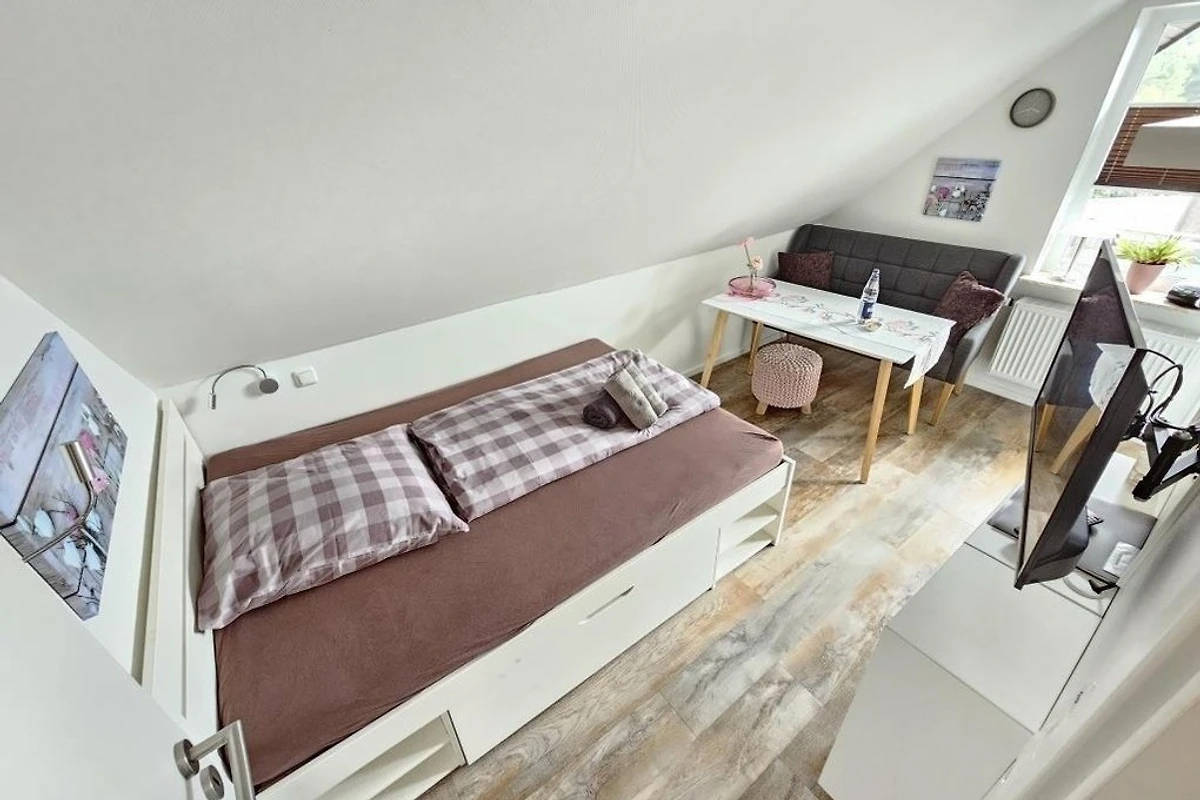 Den modernen Fernseher haben Sie sowohl vom Esstisch als auch aus dem gemütlichen Doppelbett im Blick. Die einladende Schlafstätte (140x200cm) lädt bis zu zwei Gäste zum Träumen ein.