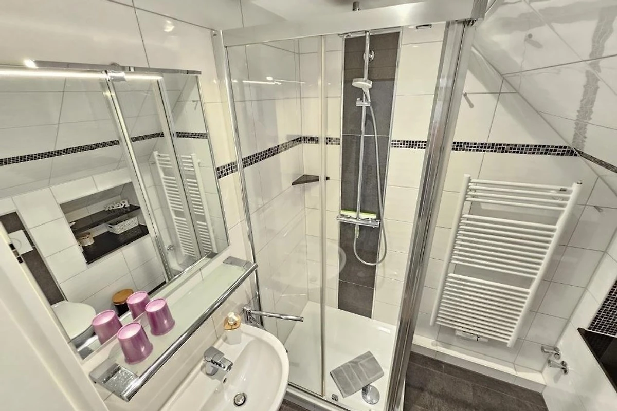 Das moderne Duschbad wurde durchdacht und grosszügig gestaltet. Die schöne Dusche mit Regenduschkopf bietet Ihnen eine feste Kabine und eine Ablage. Weiterer Stauraum wurde geschickt in das Bad integriert. Waschbecken, Spiegel, Handtuchwärmer, Föhn und WC runden den hell gefliesten Raum stimmig ab.