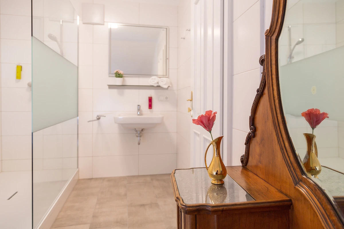 Das 2020 neu installierte Bad glänzt mit ’Walk-In' Dusche, Waschbecken, und sämtlicher Ausstattung inkl. Handtücher, Seife, Duschgel und Föhn. Geniessen Sie Ihre ganz private Wohlfühloase und fühlen Sie sich durch den antiken Ankleidespiegel wie zu Sisi's Zeiten.