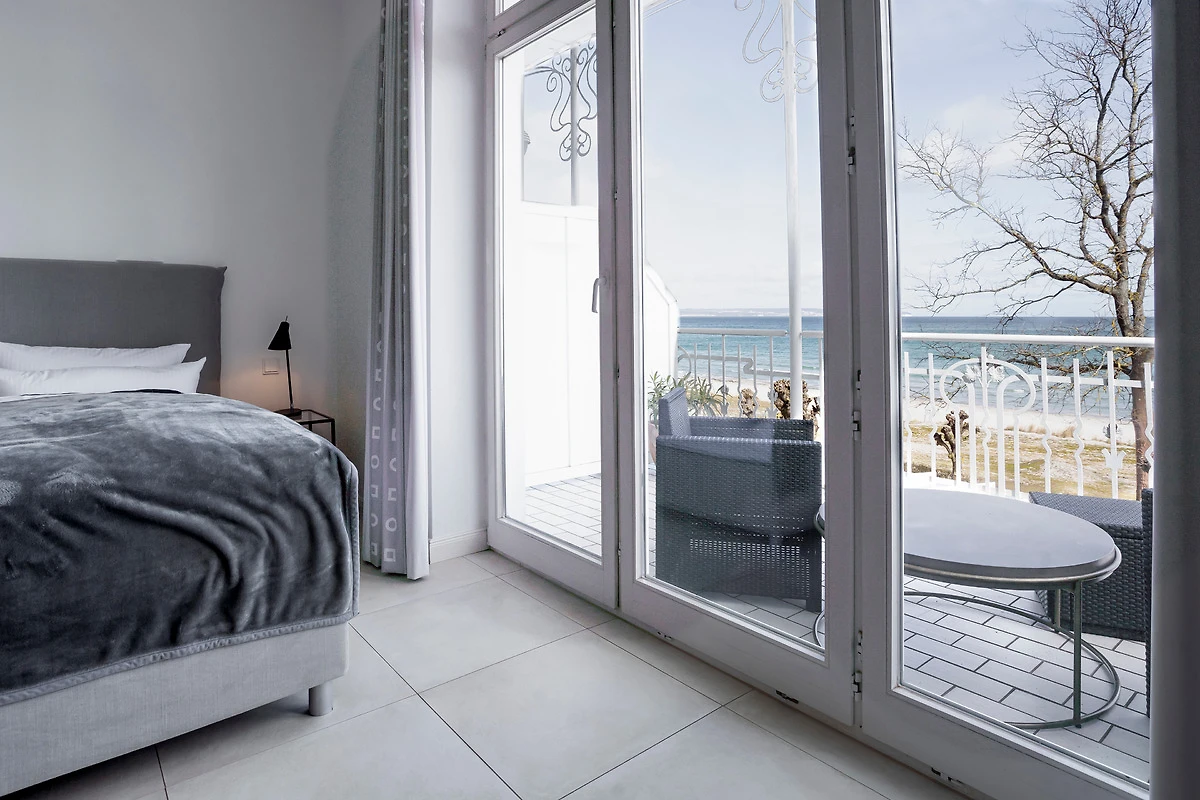 Bad mit Dusche und WC, grosszügiger Balkon mit direktem Meerblick