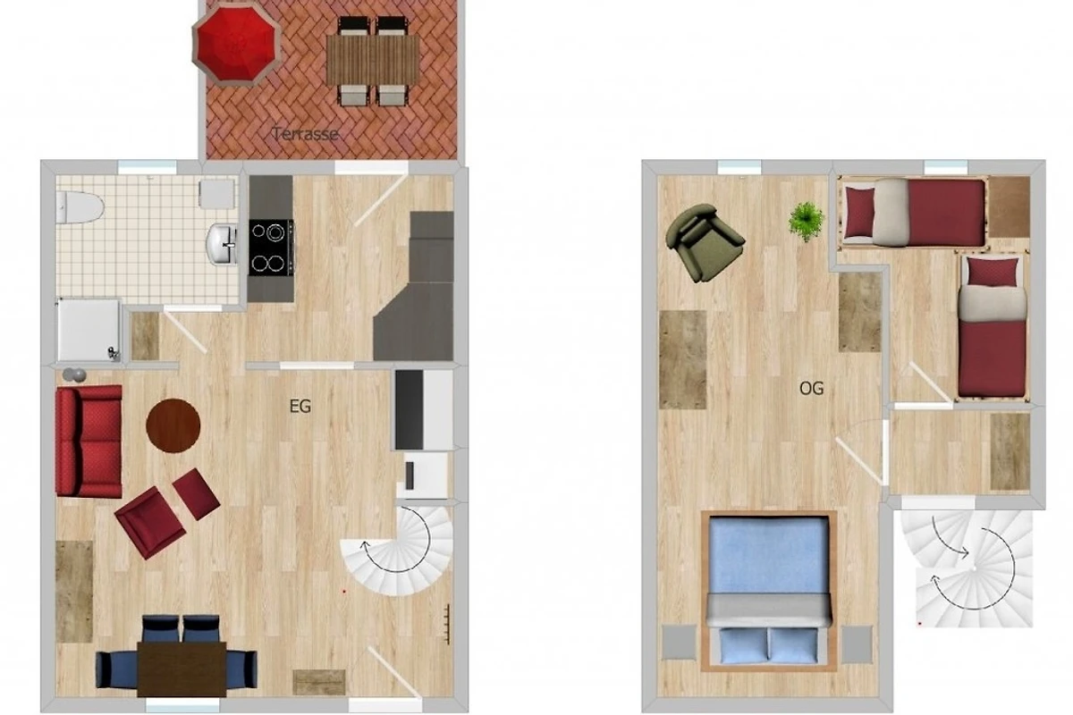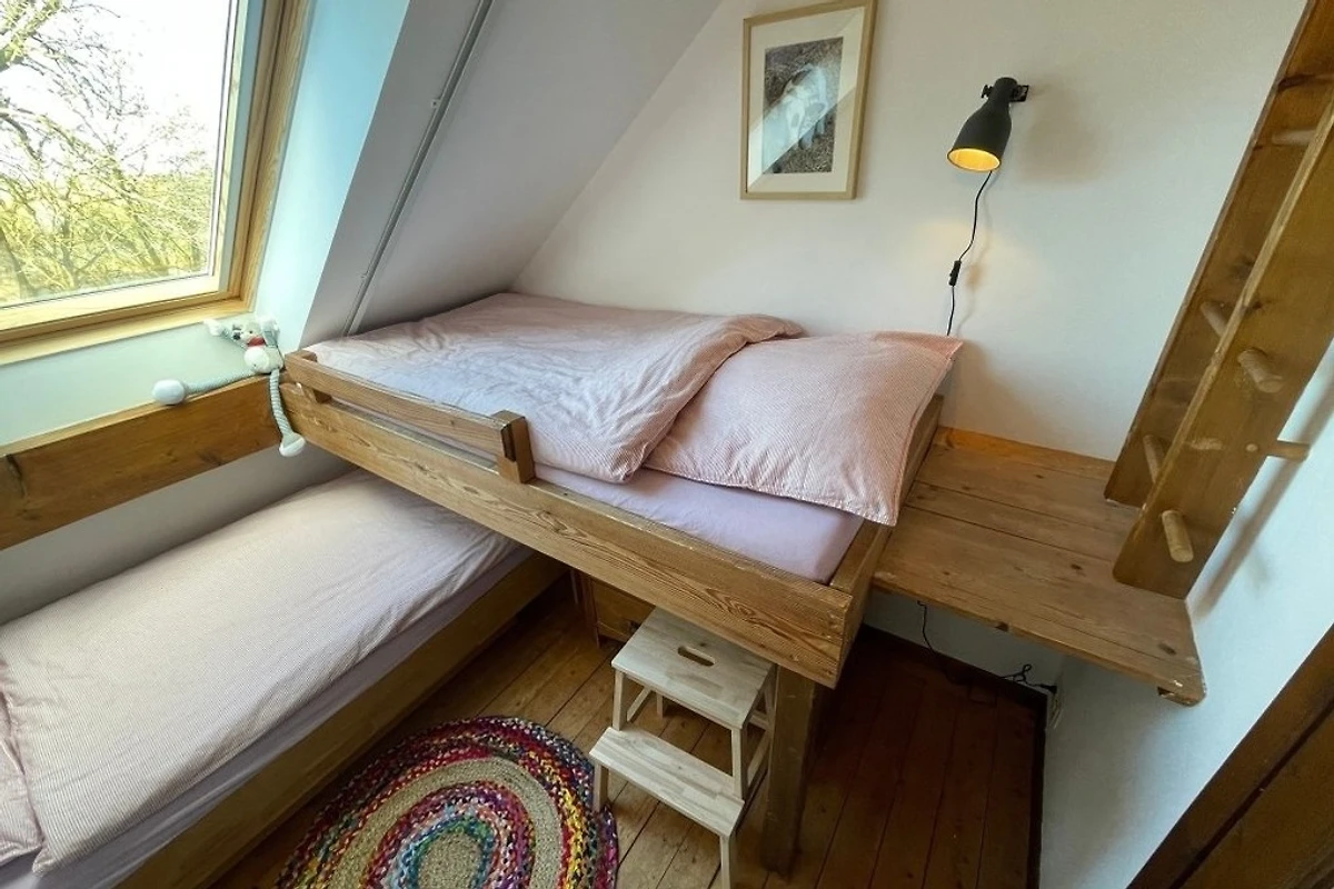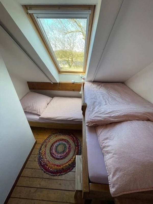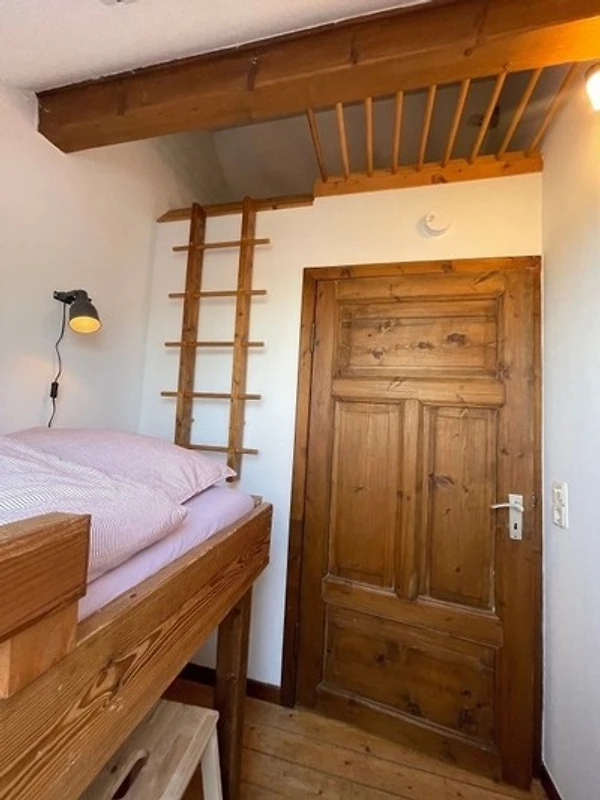 Über eine im Wohnbereich gelegene offene Wendeltreppe gelangen Sie zu den beiden Schlafräumen im Obergeschoss. Das grosse Schlafzimmer verfügt über ein Doppelbett. Im kleineren Zimmer befinden sich zwei über Eck versetzte Etagenbetten für Kinder bis 12 bzw. 16 Jahren (90x200 und 90x180cm) Jahren.