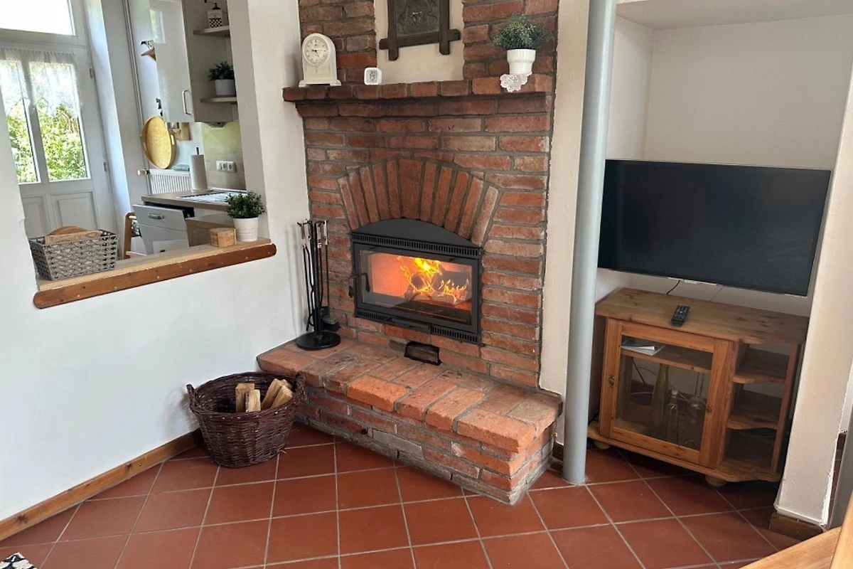 Die ca. 75m2 grosse Ferienwohnung Mühlenblick bietet Platz für 2 Erwachsene, 2 Kinder bis 16 Jahre (Etagenbett 90x200 und 90x180cm) und ein Baby/Kleinkind. Im Erdgeschoss befindet sich der Wohn- und Essbereich mit Durchreiche zur Küche. Blickfang dort ist der gemauerte offene Kamin, der behagliche Atmosphäre auch an kühleren Abenden garantiert.