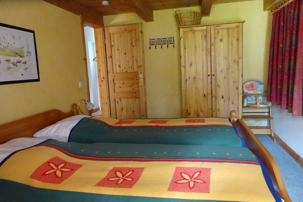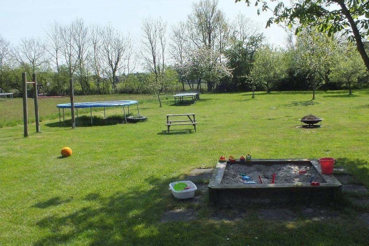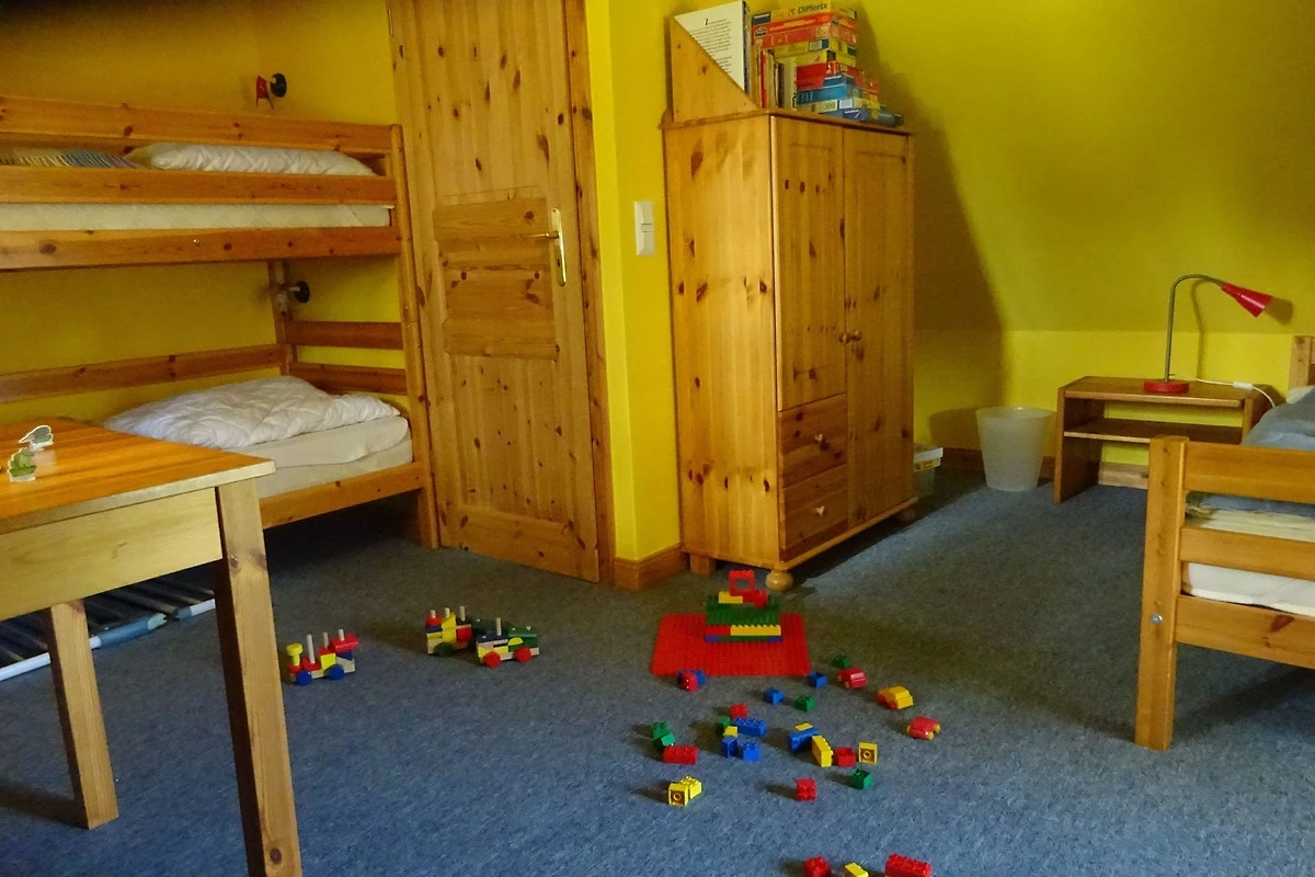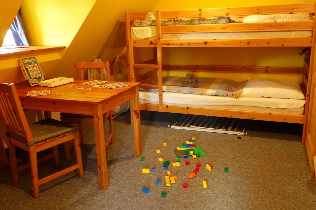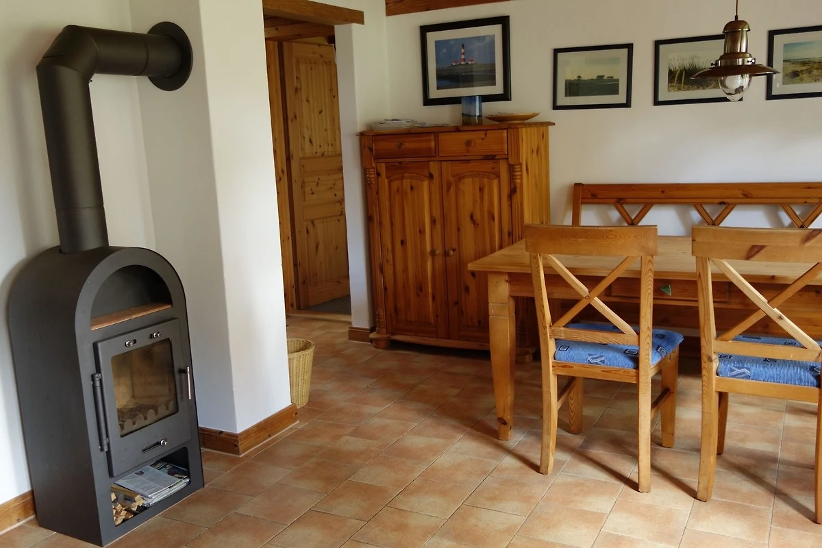 Essplatz. Das Küchenzubehör und Besteck ist für 5 Personen vorhanden. Im Anschluss daran liegt der Wohnbereich mit Sofa, Couchtisch, zwei Rattanstühlen und dem grossen Essbereich. Ein besonderes Plus ist der Kaminofen. Sie haben von hier einen direkten Zugang zur möblierten Terrasse (rechte Hälfte - siehe Foto) , sowie dem 1800 qm grossen Garten mit Schaukel, Sandkiste und Trampolin. Weiter befindet sich im EG das Elternschlafzimmer mit einem Doppelbett (Platz für ein Kinderreisebett ist vorhanden). Auch das Duschbad befindet sich im Erdgeschoss. Im Dachgeschoss liegt das Kinderzimmer mit einem Etagenbett und einem Einzelbett. Es befindet sich zusätzlich ein Tisch mit Stühlen im Zimmer zum Spielen, Malen u.a..