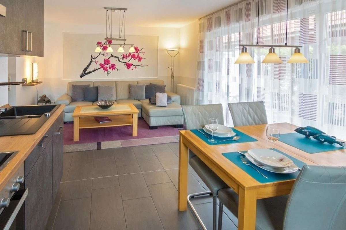 Mittelpunkt Ihres Urlaubs ist der attraktive Wohnraum. Eine einladende Ledercouch trifft hier auf den grosszügigen Essplatz und die hervorragend ausgestattete Einbauküche der Wohnung.
