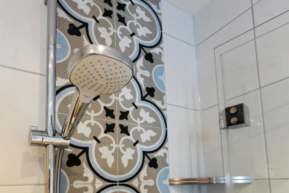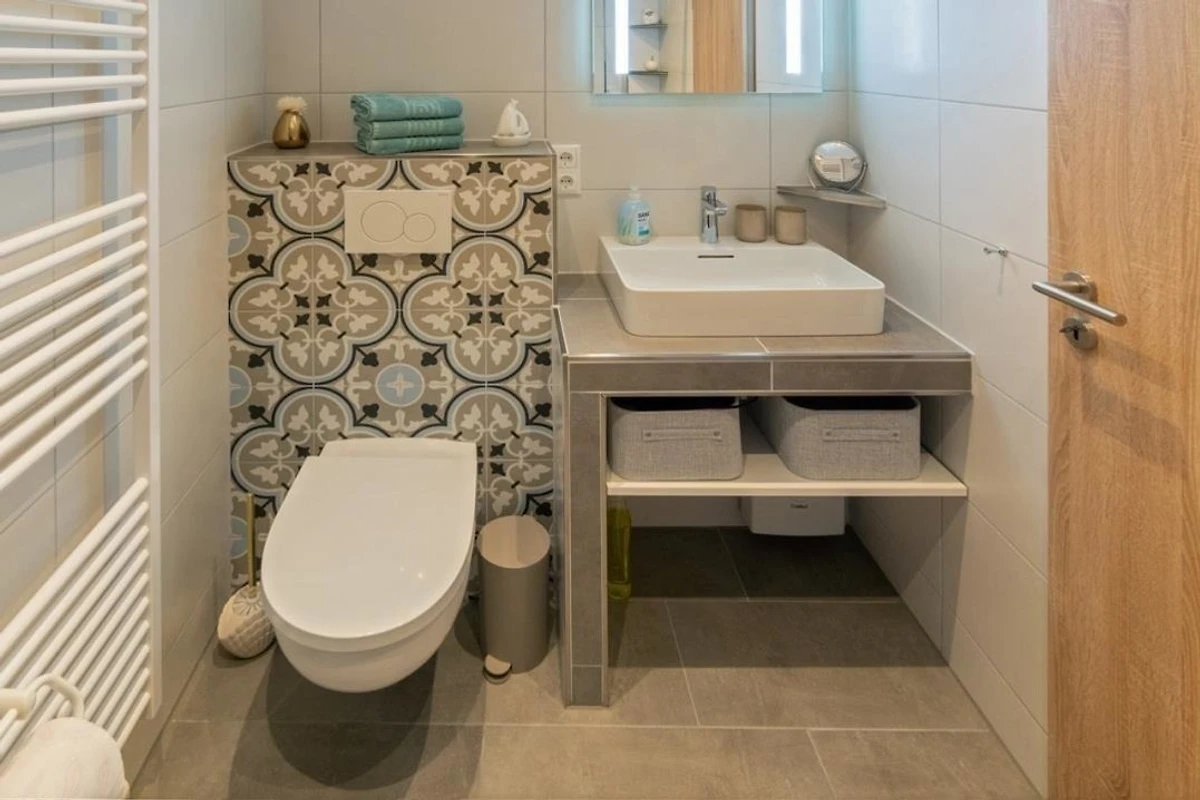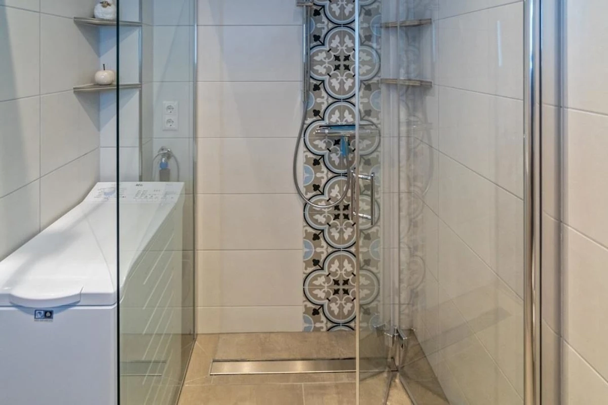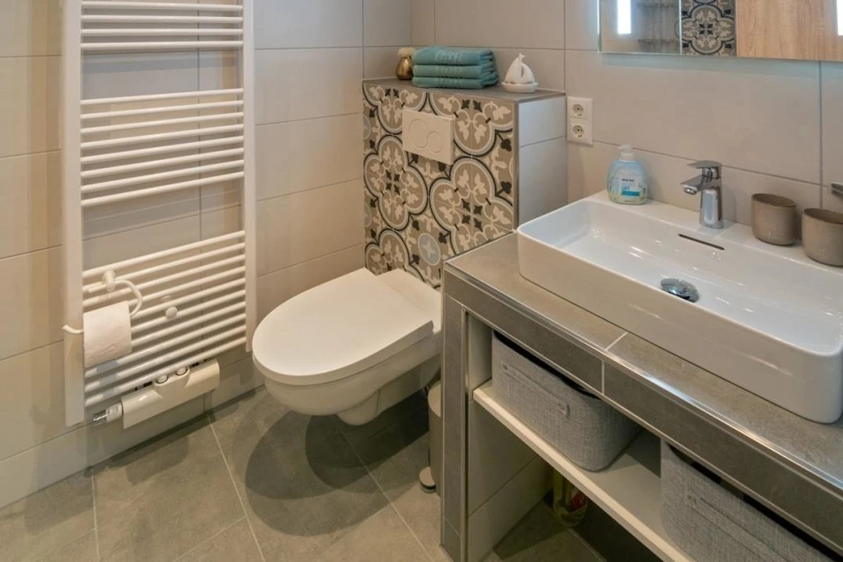 Das Badezimmer verfügt über eine bodentiefe Dusche, die Ihnen reichlich Komfort bietet. Auch ein Waschbecken mit Spiegel- und Unterschrank sorgt für eine bequeme Nutzbarkeit des Bades. Föhn, WC und ein praktischer Waschtrockner zur kostenfreien Nutzung runden das Badezimmer stimmig ab.