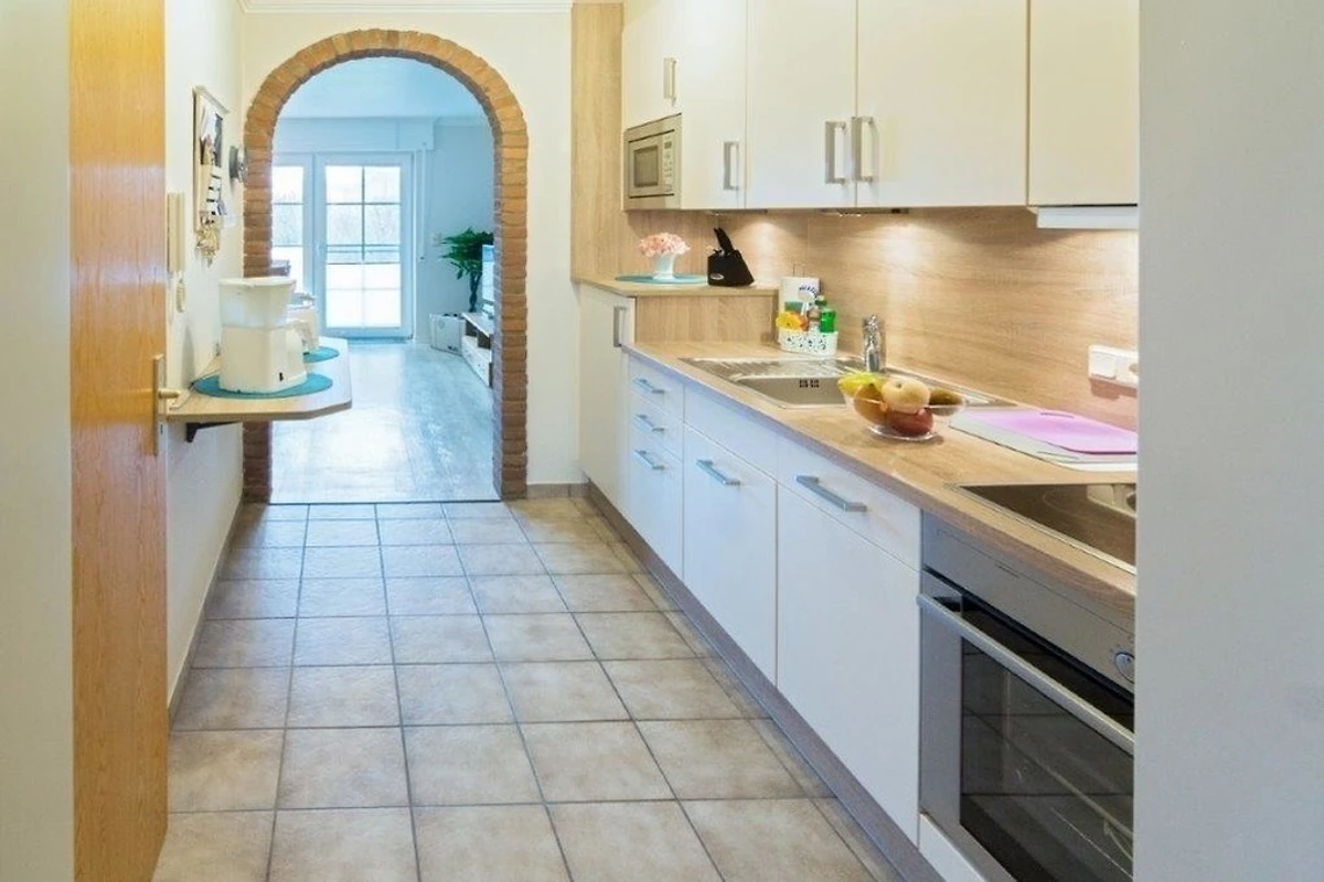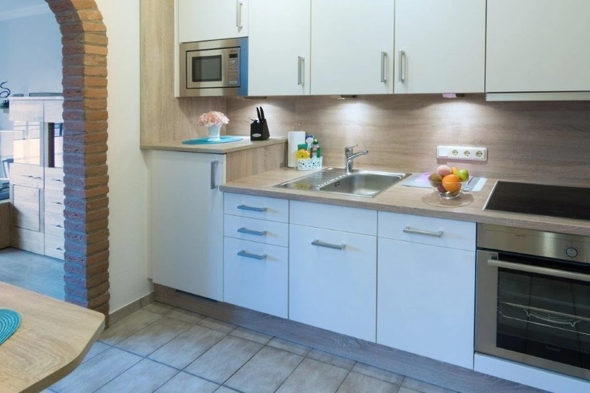 Auch die Küche wurde ansprechend ausgestattet. Alle erforderlichen Küchengeräte vom Backofen bis zur Kaffeemaschine stehen Ihnen zur Verfügung. Ein Geschirrspüler wurde ebenfalls integriert.