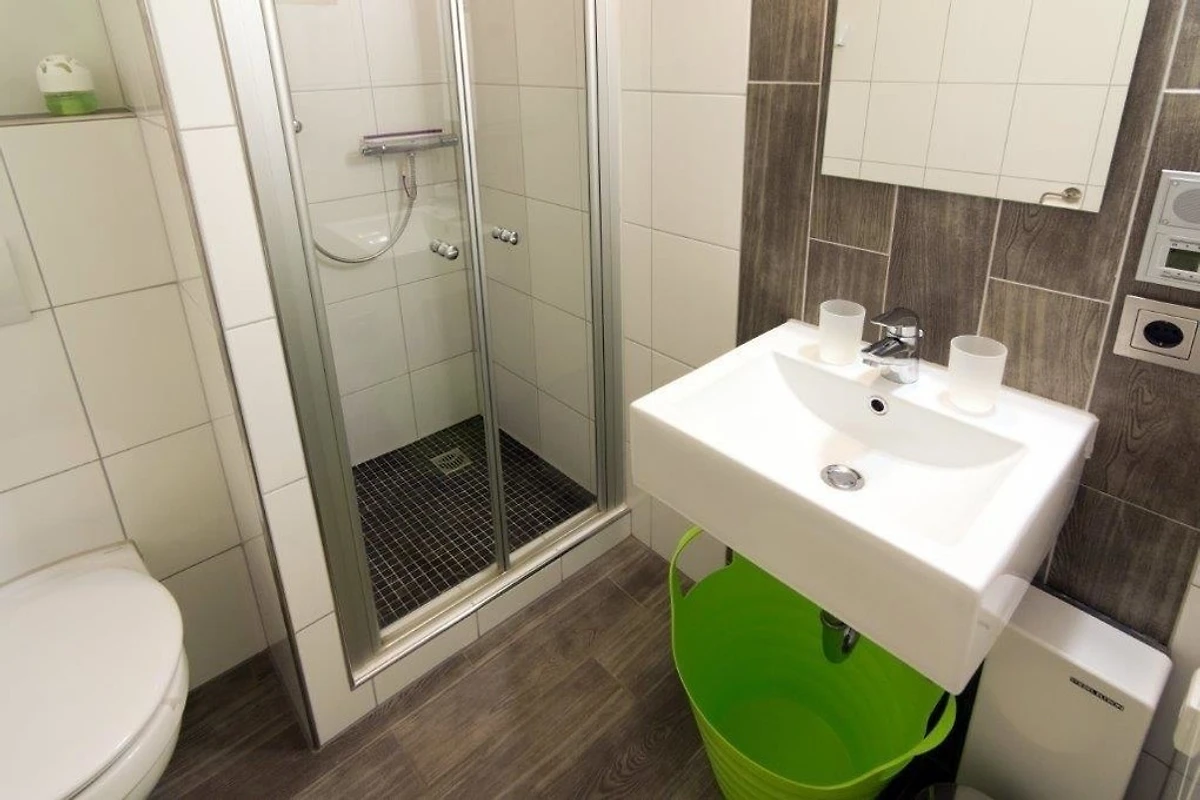 Das Badezimmer der Wohnung verfügt über eine Dusche sowie eine schöne Waschbeckenkombination, welche Ihnen eine Vielzahl an Ablagemöglichkeiten bietet. Föhn und Radio liegen bereit und sorgen für zusätzlichen Komfort im Bad.