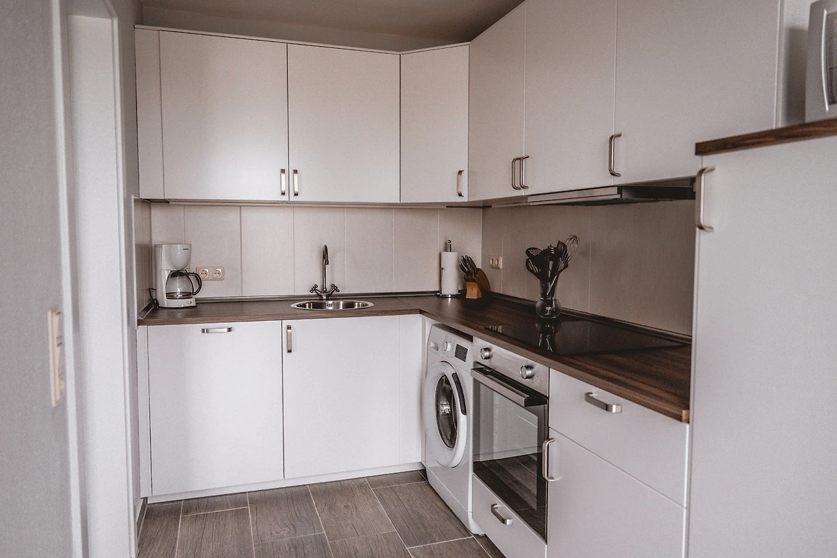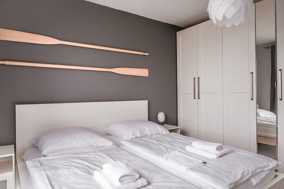 Ihr Wohnzimmer verfügt über einen Esstisch mit sechs Stühlen, ein Schlafsofa und einen Sessel. Der Wohnbereich weist eine ansprechende, maritime Ausstattung auf, vorhanden sind ein TV und ein Kabelanschluss. Auch einige Gesellschaftsspiele warten hier schon auf Sie. In Ihrem grossen Schlafzimmer befindet sich ein Doppelbett. Nachtische, Leselampen und Garderoben möchten hier von Ihnen genutzt werden. Der grosse Schrank wird Ihnen gute Dienste leisten. Im kleinen Schlafzimmer sind zwei Einzelbetten für Sie vorhanden. Auch hier befinden sich weitere Ablagen, Schränke, eine Garderobe, Nachttische und Leselampen. Ihre grosse Küche ist für Sie voll ausgestattet. Bestandteile sind unter anderem ein Cerankochfeld mit Backofen, ein Geschirrspüler, eine Waschmaschine, Kaffeemaschine, Mikrowelle, viel Geschirr, eine Kühl- und Gefrierkombination und weiteres Equipment. Das Badezimmer hält eine Badewanne mit Duschecke für Sie vor. Ablageflächen und einen Fön warten hier auch schon auf Sie. All Ihre Mitbringsel finden hier ausreichend Platz. Der Flur ist mit einer Garderobe, einem Spiegel und Abstellmöglichkeiten für Reinigungsgeräte ausgestattet.
