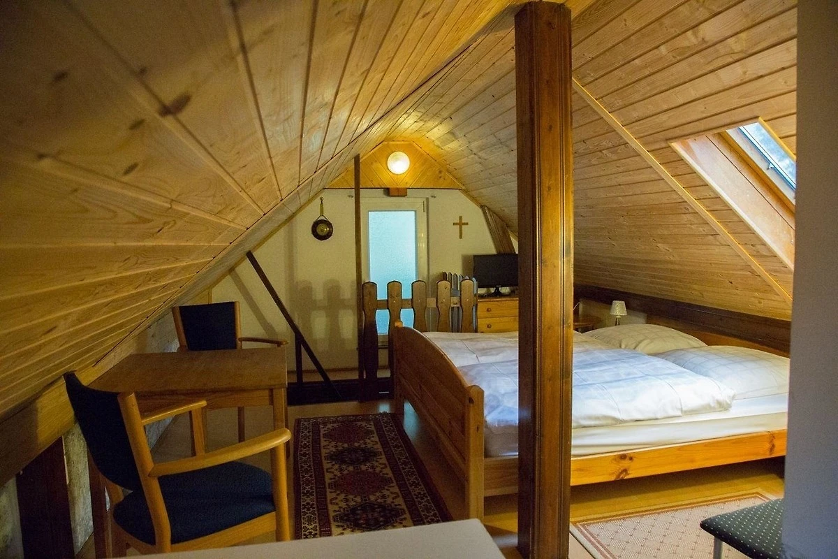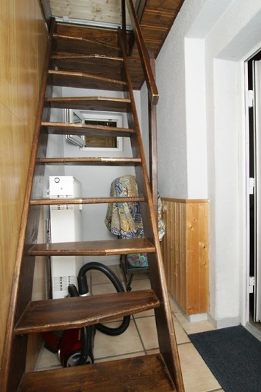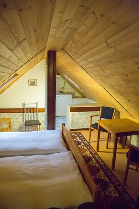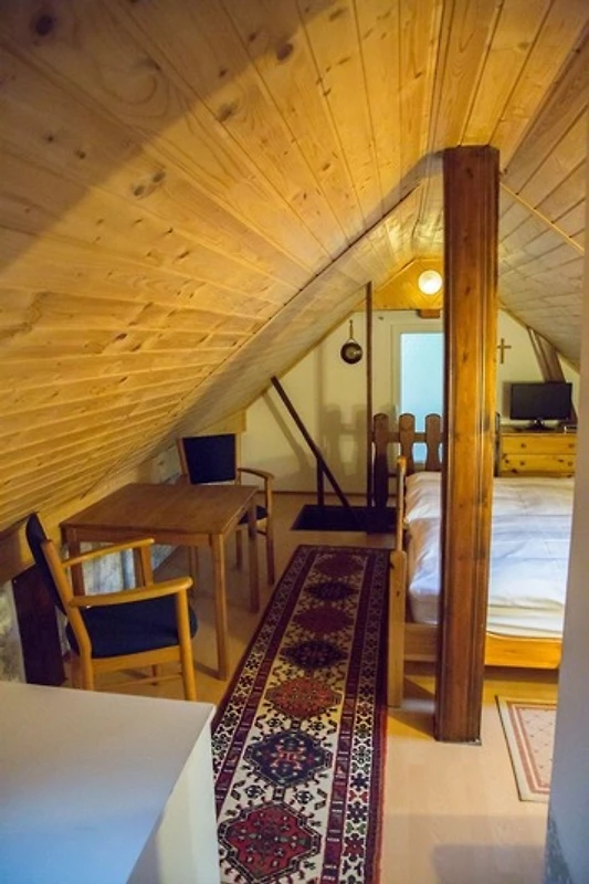 Über eine steile Innenholztreppe erreichen Sie das Dachgeschoss mit einem Schlafbereich, einer Miniküche und einem kleinen Bad. Alle Bereiche besitzen Dachschrägen mit Holzverkleidung, die nicht in allen Bereichen eine volle Standhöhe erlauben. Im Schlafbereich befindet sich ein Doppelbett (180x200cm, unter Dachschräge) und einem Fernseher. Das Zusatzbad mit Badewanne (unter Dachschräge), Waschbecken und WC ergänzt den Bereich im Obergeschoss. Sie können das Dachgeschoss sowohl über die Verbindungstür aus dem Erdgeschoss als auch über einen eigenen Eingang erreichen.