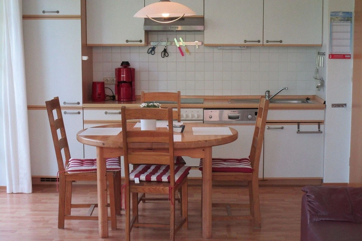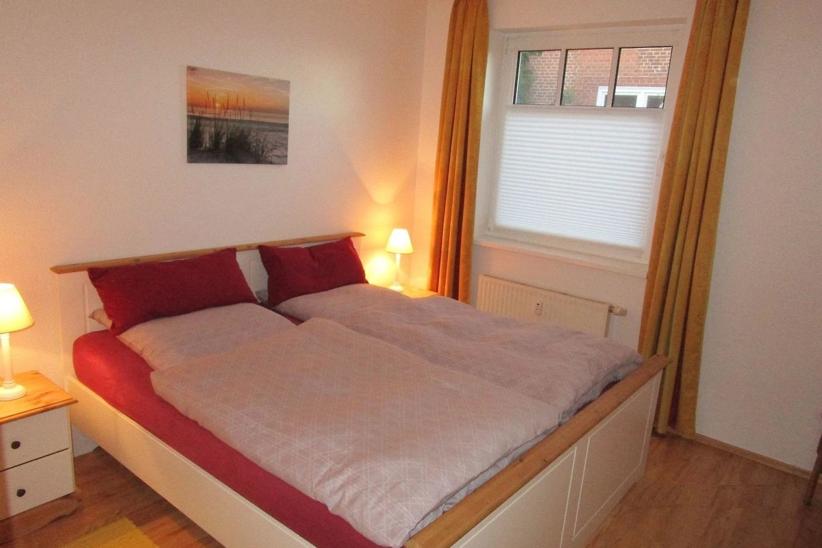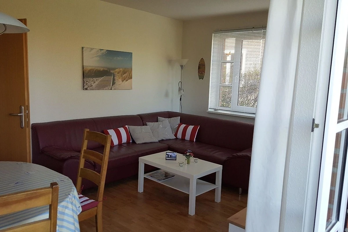 Die helle und freundliche Wohnung mit grosser Terrasse, die durch eine Hecke geschützt ist, befindet sich im Erdgeschoss. Sie wurde 2019 komplett renoviert und mit hellen Möbeln neu ausgestattet, Gartenmöbel und Liegestühle sind vorhanden. Von einem geräumigen Flur gelangen sie in alle Zimmer. Der Wohnraum mit Küchenzeile und Essbereich hat einen Zugang zur Terrasse. Zwei Schlafzimmer sind vorhanden, eins mit Doppelbett und das andere mit zwei Einzelbetten. Neben dem Duschbad steht den Gästen auch noch ein Abstellraum zur Verfügung.
