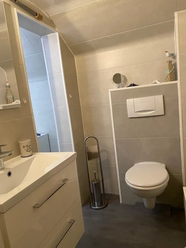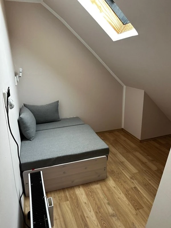 Schrankplatz ausgestattet und ein anschliessendes Badezimmer mit Dusche. Von dort aus gelangt man auf eine kleine Terrasse. Das obere Schlafzimmer ist ebenfalls mit Doppelbett und anschliessendem Badezimmer mit Badewanne ausgestattet. Ein Zimmer mit einem vollwertigem Ausziehbett für ein Kind ausgestattet.