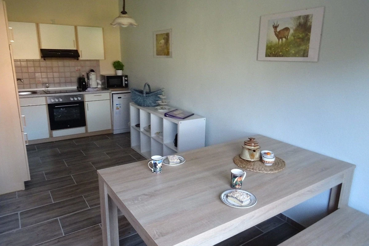 Die voll ausgestattete Küche bietet alles, was man für ein gemeinsames Kochen benötigt. Hier stehen Ihnen z.B. ein 4-Platten Herd mit Backofen, Kühlschrank, Kaffeemaschine, Wasserkocher und ein Toaster zur Verfügung.