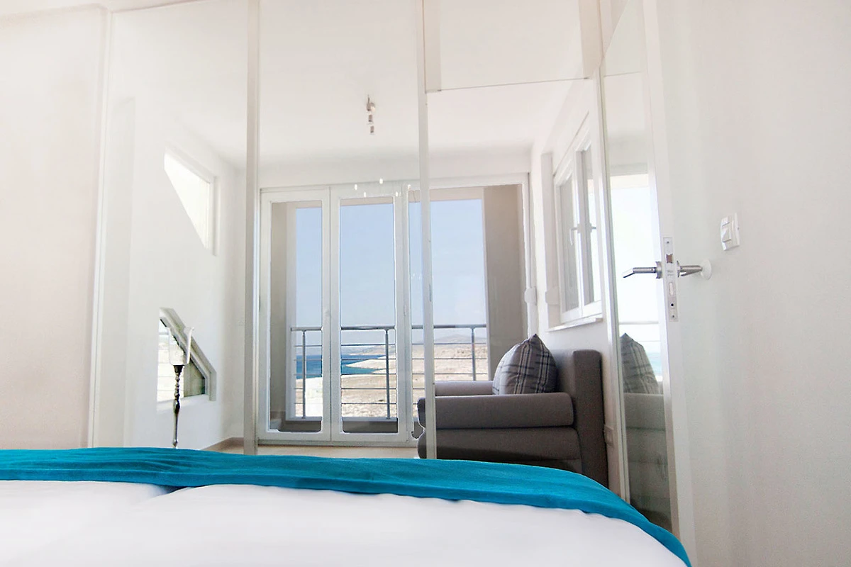 Der erste Stock ist durch eine Glaswand (mit komplettem Vorhang) mit Glastür zweigeteilt. Hinter der Glaswand befindet sich das geschmackvoll eingerichtete Schlafzimmer mit gemütlichem Doppelbett, einer Ablage und einem geräumigen Wäscheschrank mit Einbausafe. Vor der Glaswand findest du ein Sofa, welches mit wenigen Handgriffen in ein weiteres Doppelbett verwandelt wird. Hier ist auch die Balkontür und die Treppe auf die Dachterrasse.