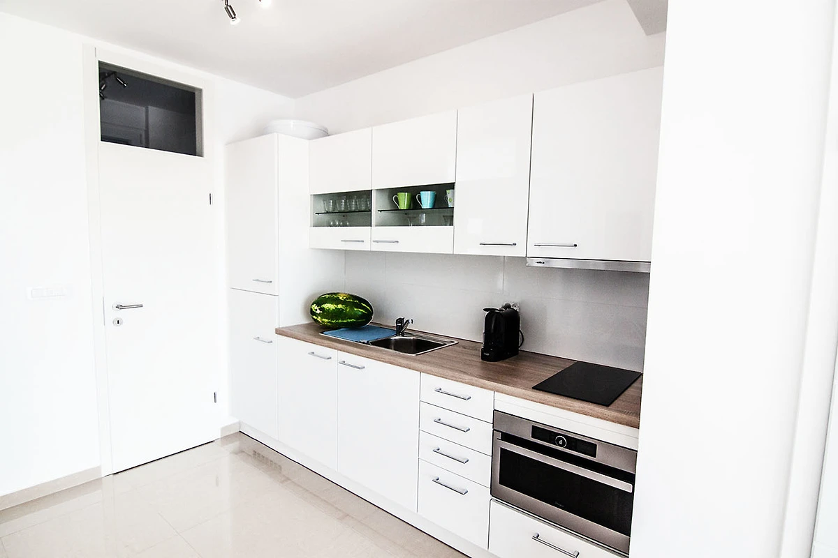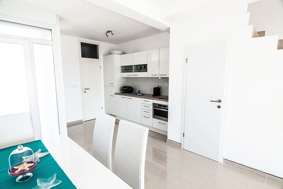 Die voll ausgestattete Küche lässt keine Wünsche offen. Jegliches Geschirr, Besteck, Töpfe, Pfannen, Dunstabzug, Ceranfeld, Backofen mit Mikrowelle, Kaffeemaschine, Kühlschrank mit Eisfach usw. sind vorhanden. Die dort zubereiteten Speisen geniesst du am besten am schönen Esszimmertisch mit direktem Blick durch die Glasfront auf das Meer und die Berge. Im hinteren Wohnbereich des Erdgeschosses chillst du auf dem Sofa mit Blick auf das Meer, den Fernseher oder in dein Buch.