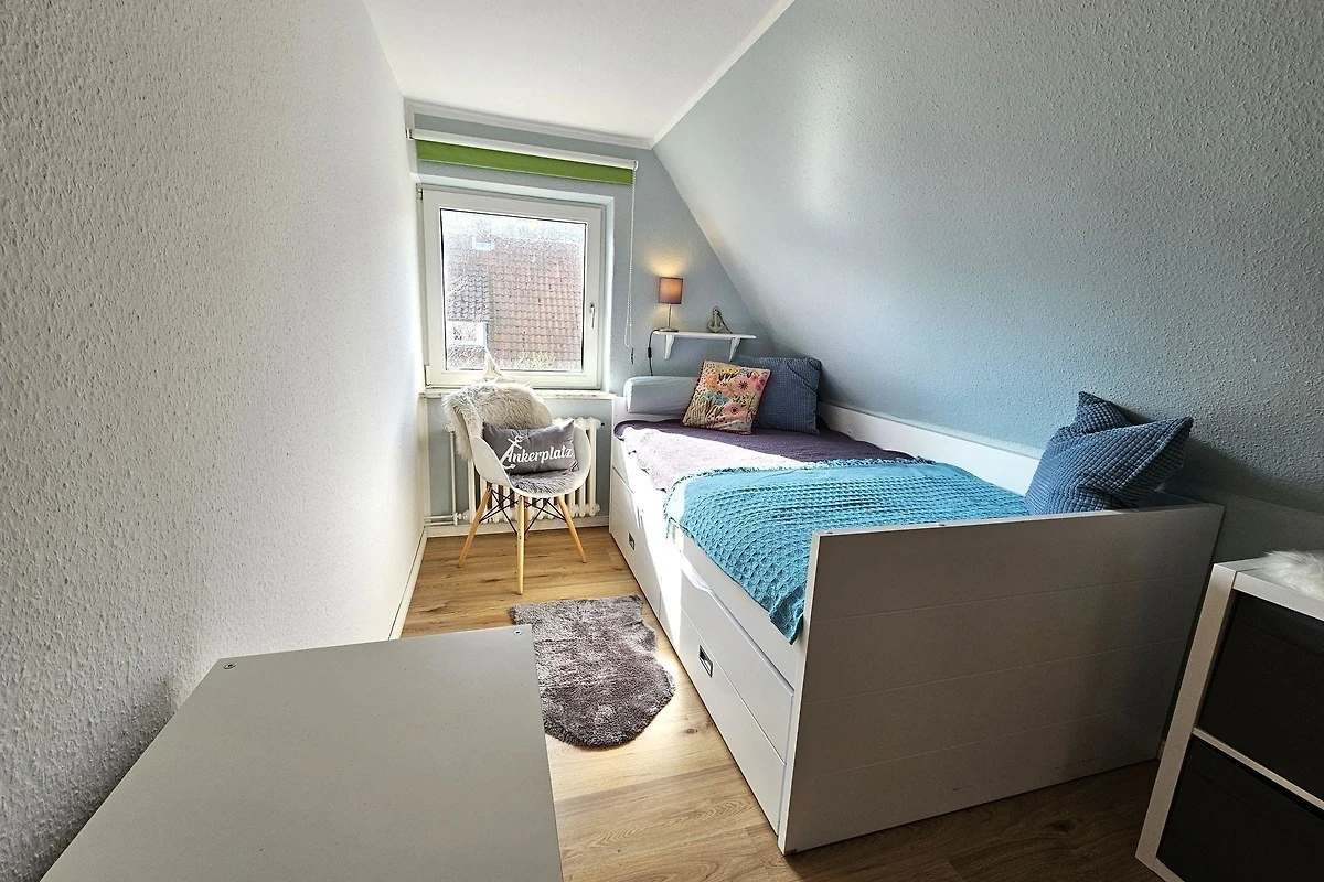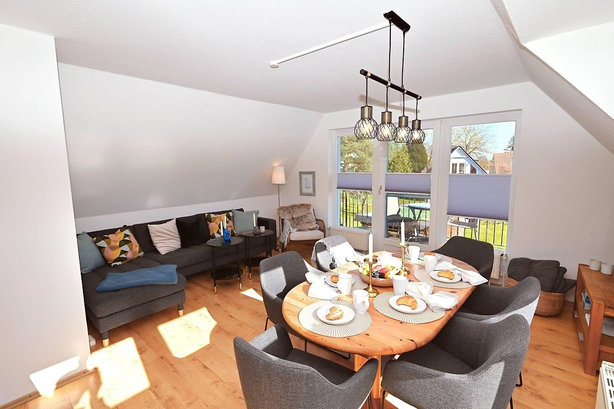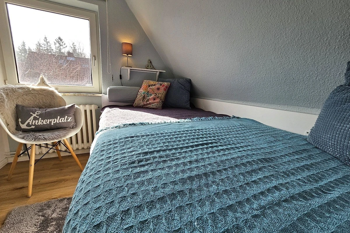 Die Wohnung Ankerplatz im Obergeschoss des Hauses Vineta bietet auf etwa 70 Quadratmetern Platz für bis zu 6 Personen. Die drei Schlafzimmer sind wie folgt ausgestattet: ein Schlafzimmer mit Doppelbett (Boxspringbett), ein weiteres mit zwei Einzelbetten und ein drittes mit einem Ausziehbett (120x200 cm, ausziehbar auf 90x200 cm). Jedes Schlafzimmer verfügt über einen eigenen Kleiderschrank. Zwei Tageslichtbadezimmer sind vorhanden, jeweils ausgestattet mit einem Waschbecken, WC und Duschkabine. Der grosszügige Wohn- und Essbereich lädt mit komfortabler Einrichtung und einem Smart-TV zum Verweilen ein. Die offene Küche ist in den Wohnraum integriert. WLAN steht kostenfrei zur Verfügung. Ein PKW-Stellplatz ist ebenfalls inklusive. Haustiere sind erlaubt.