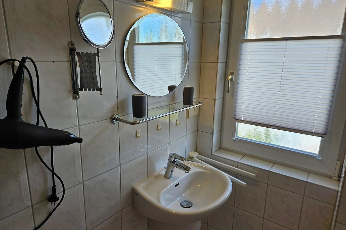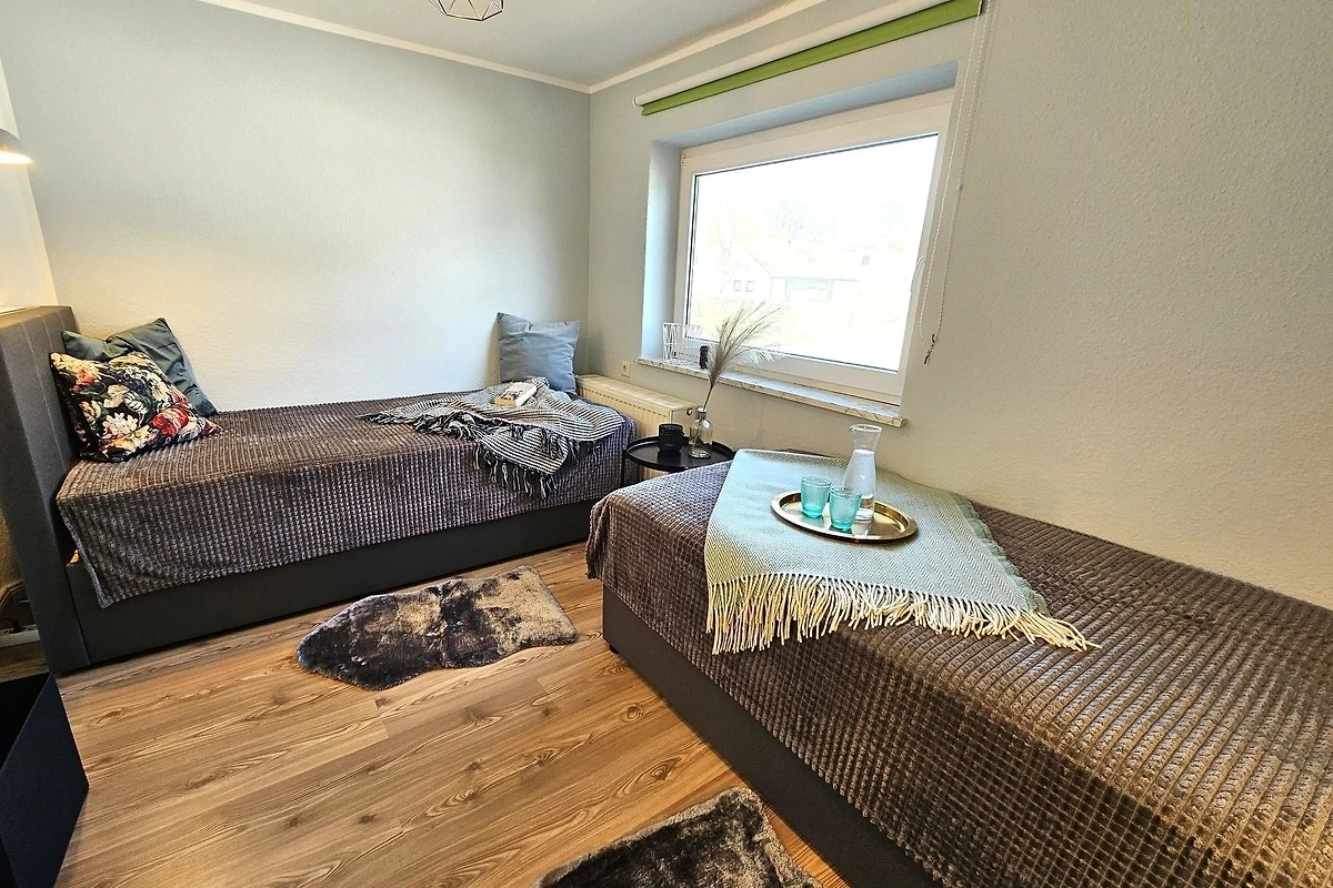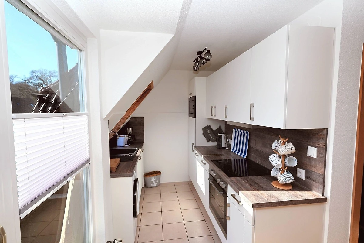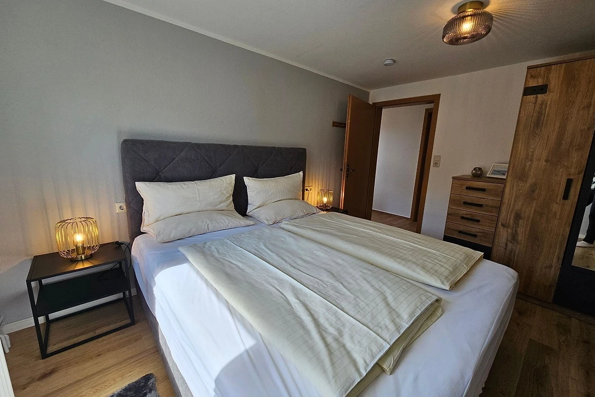 Die Wohnung Ankerplatz im Obergeschoss des Hauses Vineta bietet auf etwa 70 Quadratmetern Platz für bis zu 6 Personen. Die drei Schlafzimmer sind wie folgt ausgestattet: ein Schlafzimmer mit Doppelbett (Boxspringbett), ein weiteres mit zwei Einzelbetten und ein drittes mit einem Ausziehbett (120x200 cm, ausziehbar auf 90x200 cm). Jedes Schlafzimmer verfügt über einen eigenen Kleiderschrank. Zwei Tageslichtbadezimmer sind vorhanden, jeweils ausgestattet mit einem Waschbecken, WC und Duschkabine. Der grosszügige Wohn- und Essbereich lädt mit komfortabler Einrichtung und einem Smart-TV zum Verweilen ein. Die offene Küche ist in den Wohnraum integriert. WLAN steht kostenfrei zur Verfügung. Ein PKW-Stellplatz ist ebenfalls inklusive. Haustiere sind erlaubt.