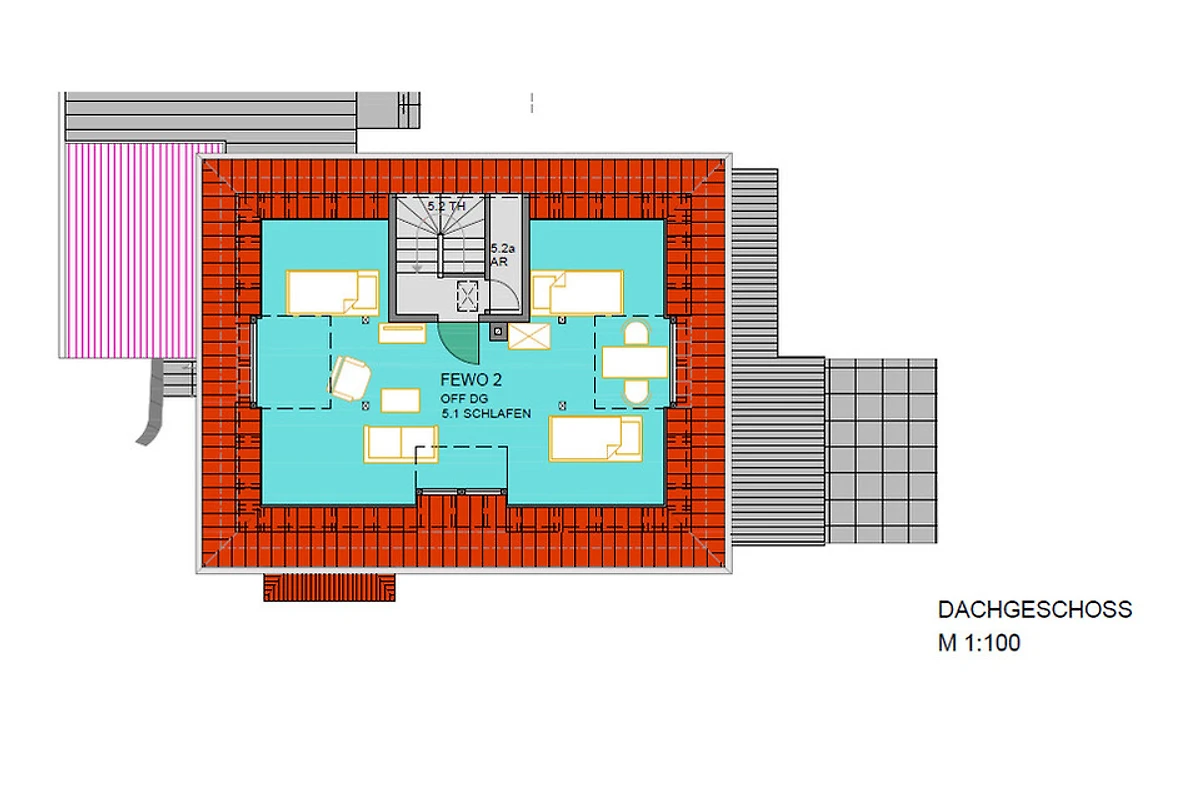 Auch diese Wohnung verfügt über getrennte Schlafzimmer. Neben dem klassischen Schlafzimmer mit Doppelbett ist das ganze Dachgeschoss für die Kinder- oder weitere Gästeschar zu einem geräumigen Schlafboden ausgebaut. Hier stehen ein Doppelbett, ein Einzelbett sowie ein Schlafsofa zur Verfügung.