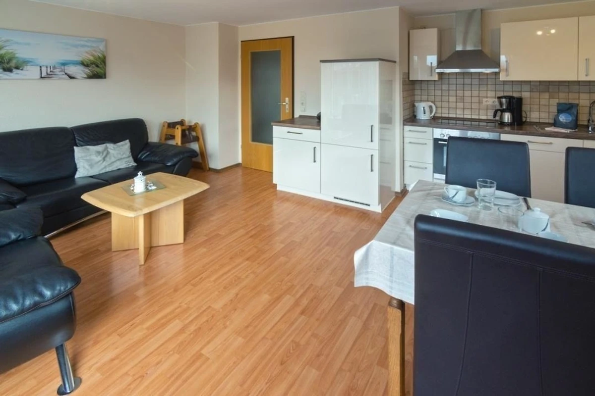 Zentrum der Unterkunft ist der offen gestaltete Wohnraum, welcher neben einladenden Polstermöbeln auch genügend Platz für den Esstisch und die Küche der Wohnung bietet. Hier können Sie mit Freude kochen, gemeinsam Essen oder entspannte Abende geniessen. Selbstverständlich steht auch ein Fernseher zur Verfügung, so dass für eine abwechslungsreiche mediale Unterhaltung gesorgt ist. Das Zimmer ist wunderbar hell und lichtdurchflutet. Sie haben von hieraus zudem Zugang zum Balkon der Wohnung.