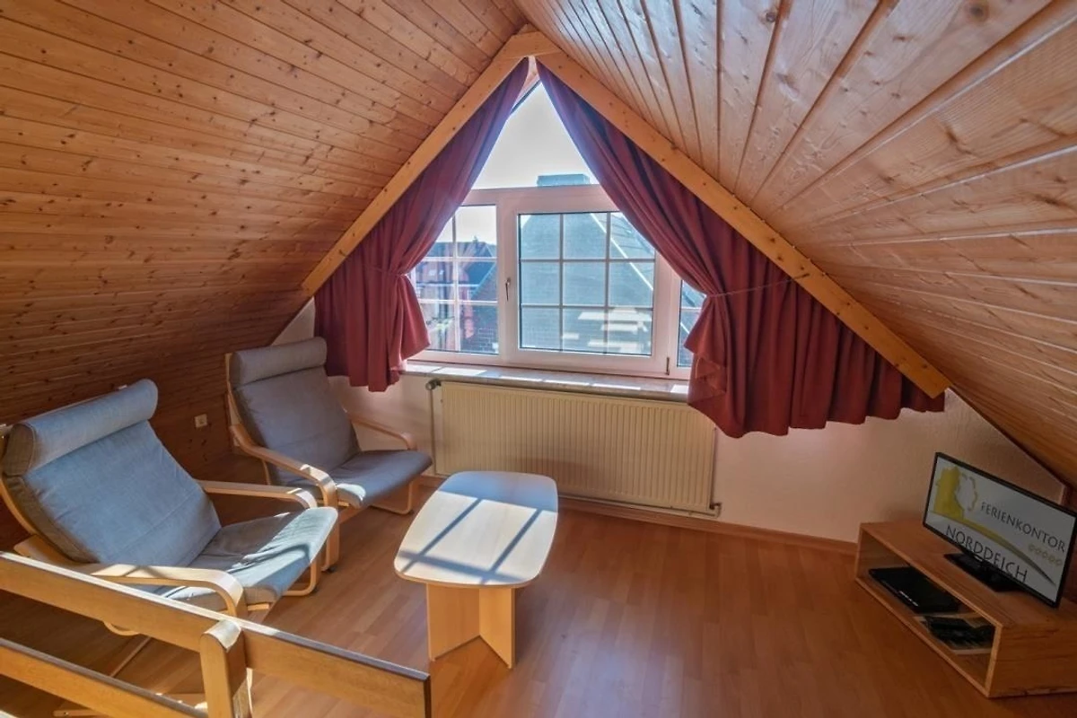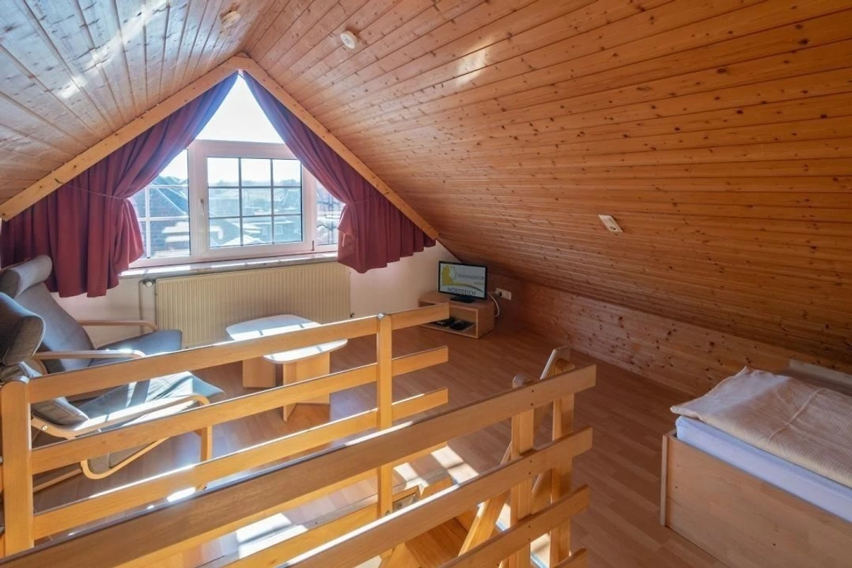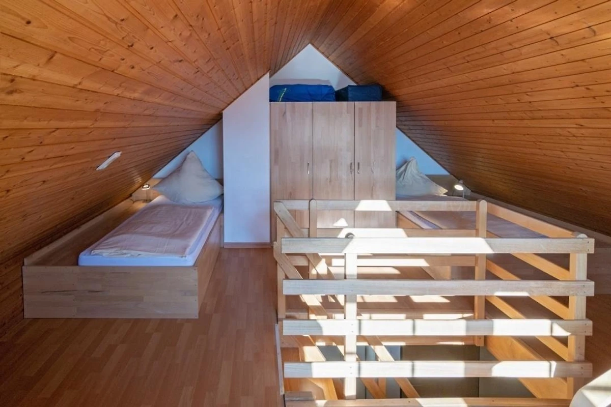 Das zweite Schlafzimmer ist über eine Treppe zu erreichen und befindet sich auf der oberen Ebene der Wohnung. Hier erwarten Sie zwei Einzelbetten (jeweils 80x200cm). Auch hier wurde ein Schrank integriert, so dass das Gepäck gut verstaut werden kann. Zwei Sessel mit Tisch und ein eigener Fernseher sorgen dafür, dass das zweite Schlafzimmer auch tagsüber ein gemütlicher Rückzugsort ist.