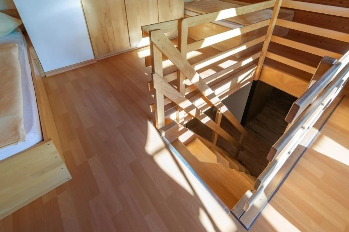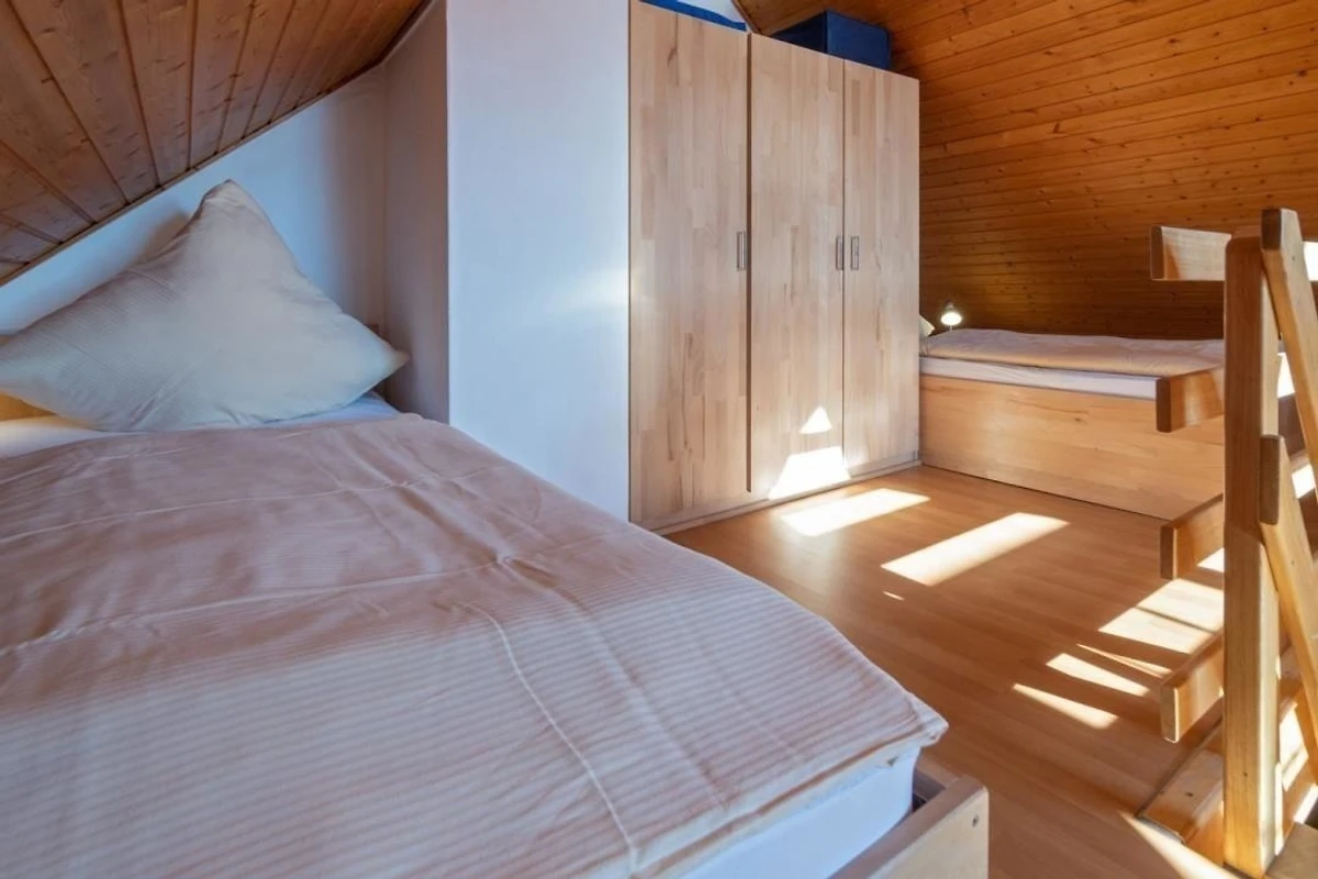 Der untere Schlafraum wurde mit einem grossen Doppelbett (180x200cm) möbliert. Integrierte Beleuchtung im Kopfteil sorgt hier für ein gemütliches Ambiente. Für Ihre Garderobe steht ein Schrank zur Verfügung, welcher Stauraum bietet.