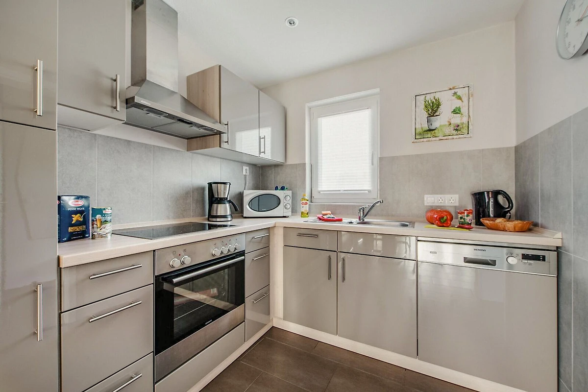 1 moderne vollausgestattete Küche mit Geschirrspüler, Mikrowelle, E-Herd (Ceran) mit Backofen, Kühl-/ Gefrierkombination, Toaster, Kaffeemaschine, Mikrowelle u.v.m.