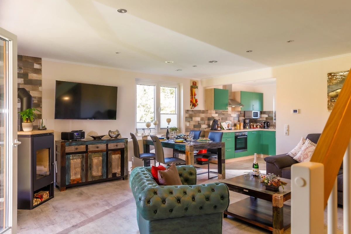 1 Wohn- / Essbereich mit Schlafcouch (für 1 - 2 Personen) mit Fussbodenheizung , Holzofen-Kamin, grossen Flachbildschirm
