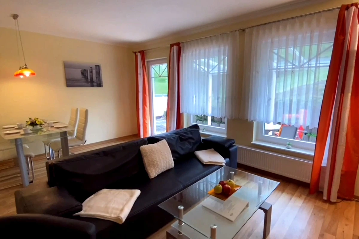 Viel Platz für einen erholsamen Urlaub. Die Wohnung 3 im Haus Meeresrauschen ist eine grosszügig geschnittene 2- Zimmer Wohnungen für 2 bis 4 Personen. Die hell und freundlich eingerichtete Wohnung empfängt Sie mit ihrem wohnlichem Ambiente. Hier können Sie mal so richtig ausspannen. An den gemütlichen Wohnraum mit Sofa und Essbereich schliesst sich direkt die ca 20 m² grosse Terrasse, wo Sie abends bei einem Gläschen Wein in netter Runde den Tag ausklingen lassen können. Die offene Küche der 2-Zimmer Wohnungen bietet allen Komfort: 4-Platten Ceran Kochfeld mit Backofen, ein grosser Kühlschrank, Spühlmaschine, Kaffeemaschine, Wasserkocher, Toaster und diverse weitere Küchenutensilien. Im Schlafzimmer lädt das komfortable Doppelbett ein, morgens auch mal etwas länger liegen zu bleiben. Zwei weitere Personen finden auf der mit wenigen Handgriffen aufgebauten Schlafcouch im Wohnbereich einen bequemen Schlafplatz. Selbstverständlich verfügt diese Wohnung über ein modernes Duschbad und einen Parkplatz am Haus.