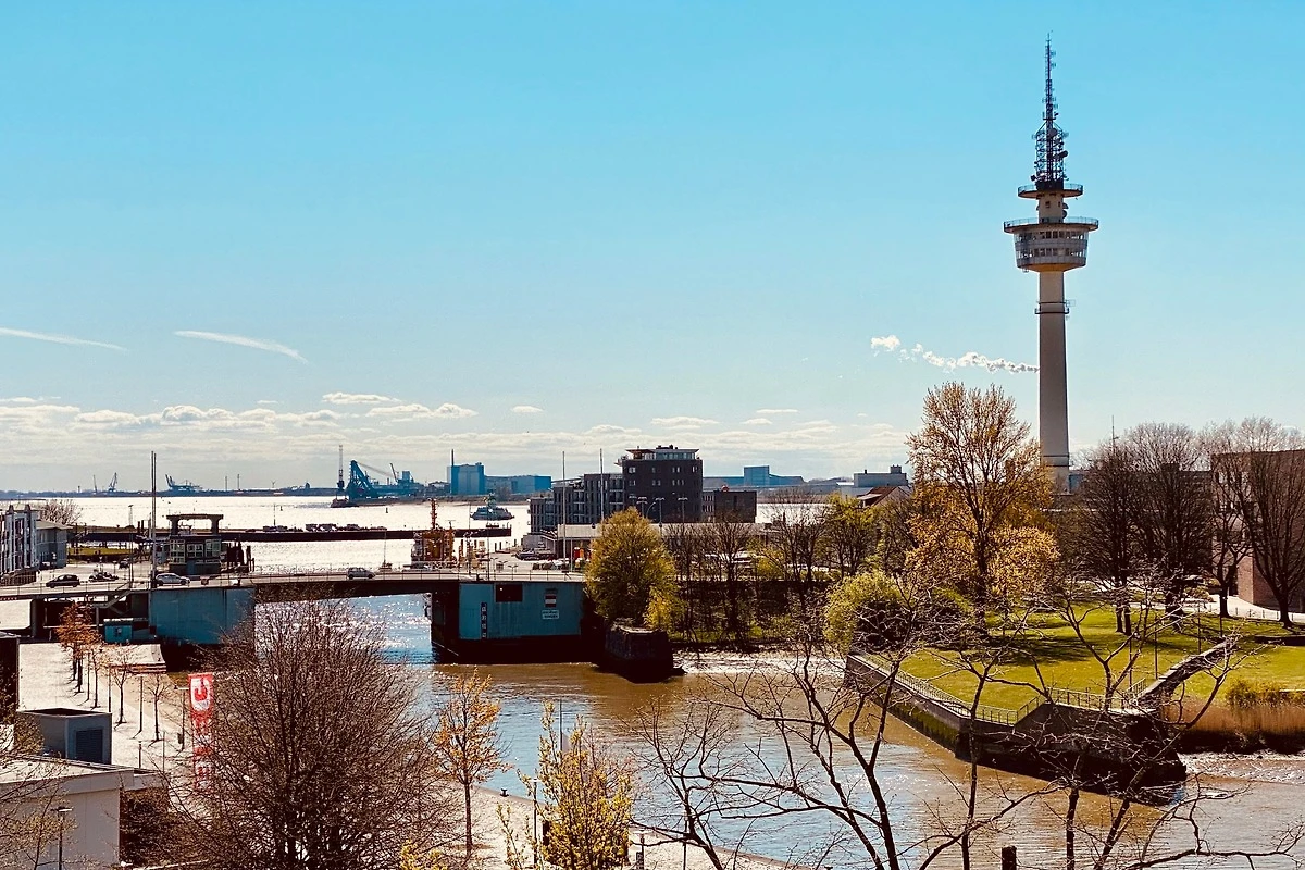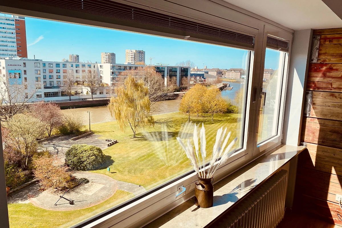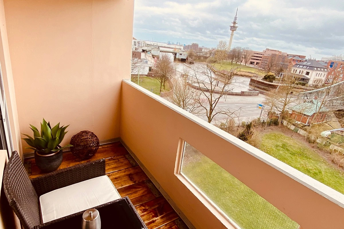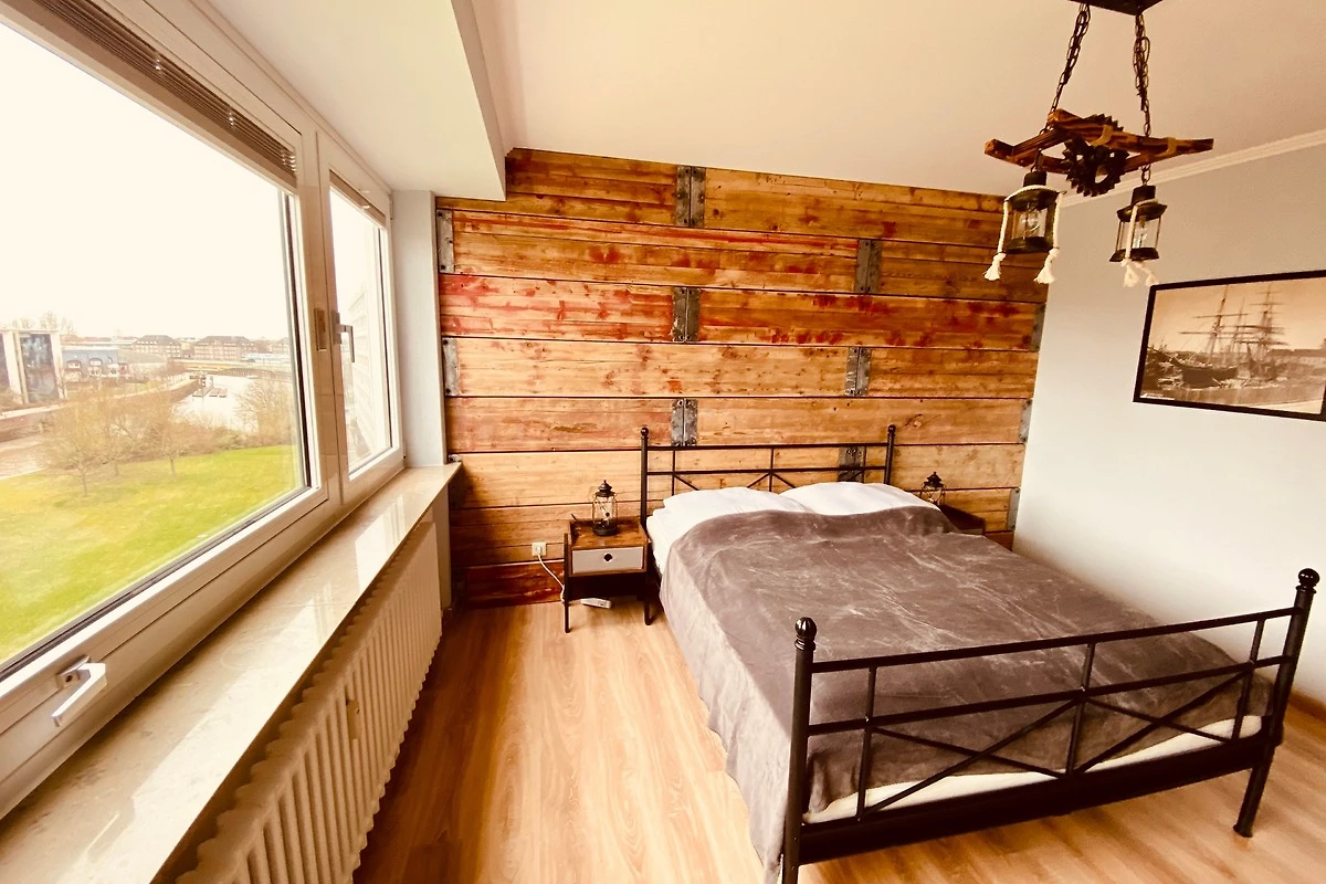 Die Ferienwohnung RIVER DOCKS bietet Ihnen von einem offenen Balkon und der zusätzlichen verglasten Loggia einen Panoramablick auf die Geeste (direkt am Haus), die Weser mit ihren Hochseeschiffen und die Skyline Bremerhavens.
