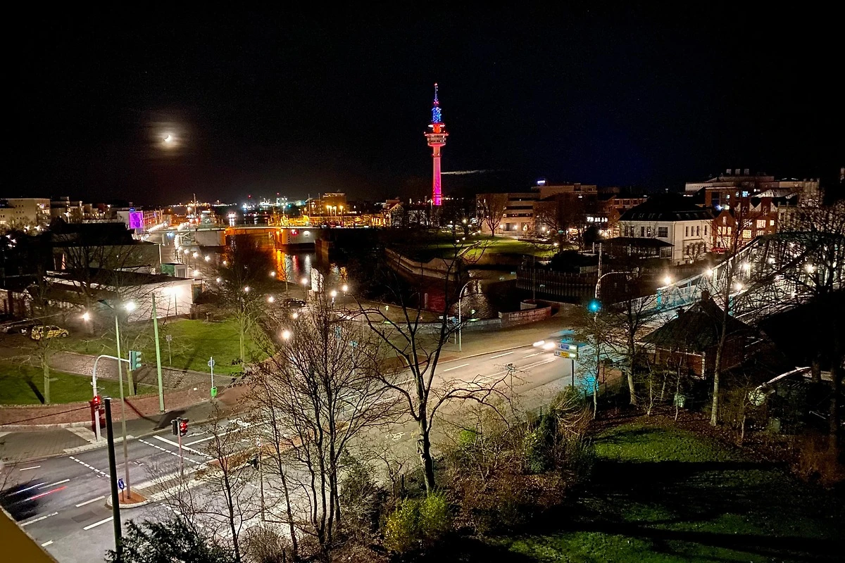 Vom offenen Balkon und der verglasten Lounge-Loggia haben Sie freie Sicht auf die Geeste direkt vor dem Haus und die Weser mit dem regen Schiffsverkehr. Die Zimmer bieten ebenfalls einen tollen Ausblick auf die Geeste, Weser oder Stadt. Die rot leuchtenden Sonnenuntergänge können Sie, je nach Jahreszeit, am besten auf dem Balkon, der Glasloggia oder vom privatem Park direkt am Ufer der Geeste bewundern.