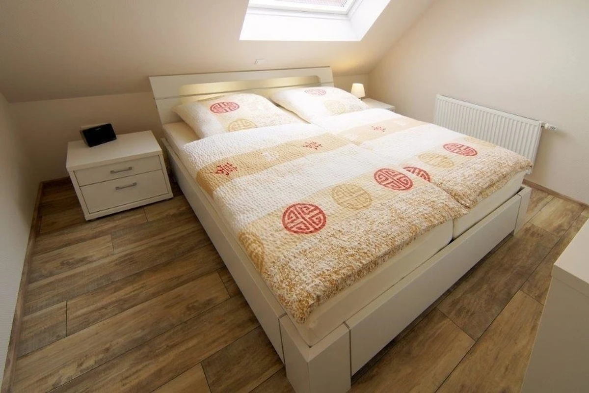 Das Schlafzimmer befindet sich bei dieser Wohnung im Obergeschoss und ist mit einem Doppelbett ausgestattet. Dazu gehören zwei Nachttische, ein Wecker oder Radiowecker und zwei Nachttischlampen. Der Kleiderschrank mit Kleiderbügeln fasst Ihre komplette Urlaubsgarderobe. Für die ganz Kleinen können wir ein Reisekinderbett hinzustellen.