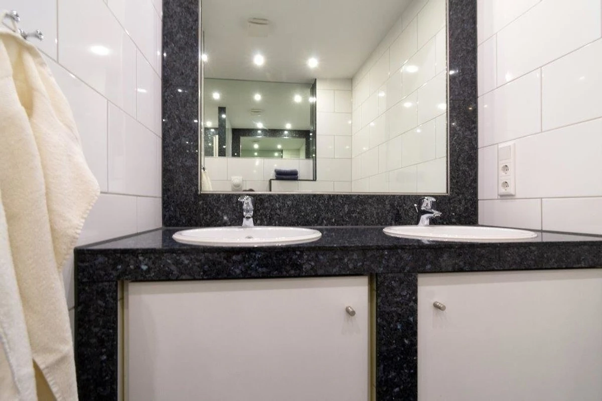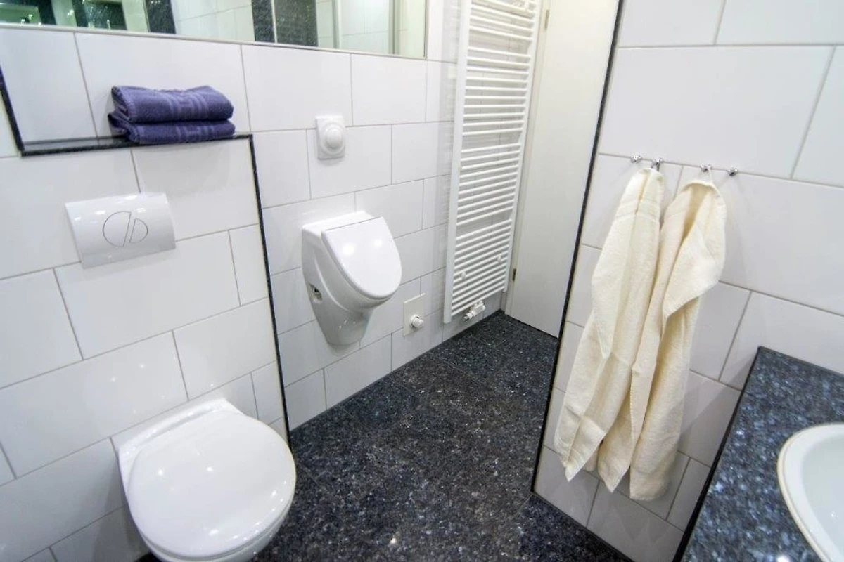 Dusche, Hänge-WC und ein Urinal Becken sowie Fussbodenheizung, Waschkombination mit grossem Spiegel, Föhn.