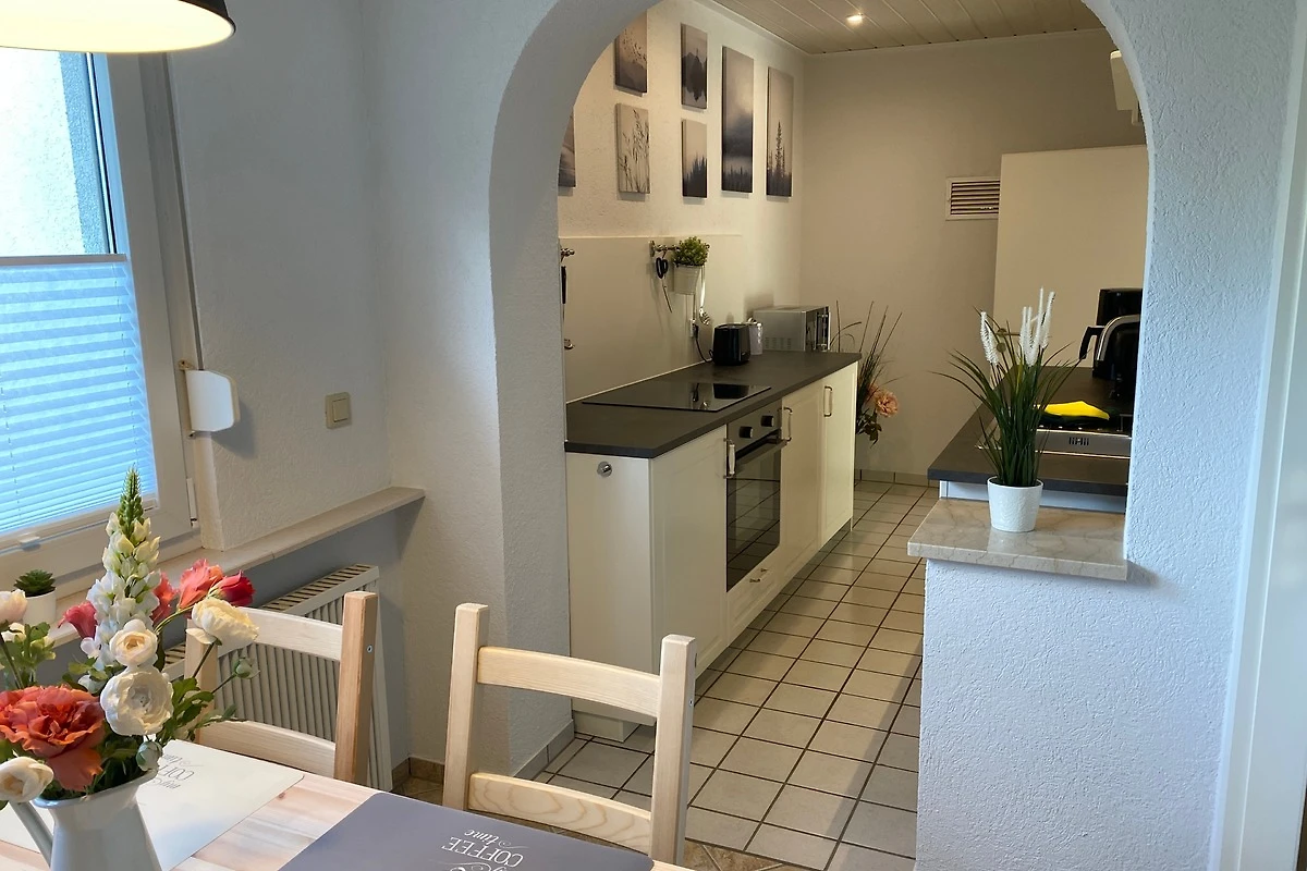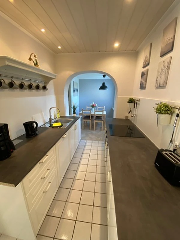 Die Küche ist voll ausgestattet, und verfügt über einen Essbereich mit vier Plätzen, Kaffeemaschine, Toaster, Wasserkocher, Mikrowelle, Ceranfeld, Backofen und Geschirrspüler