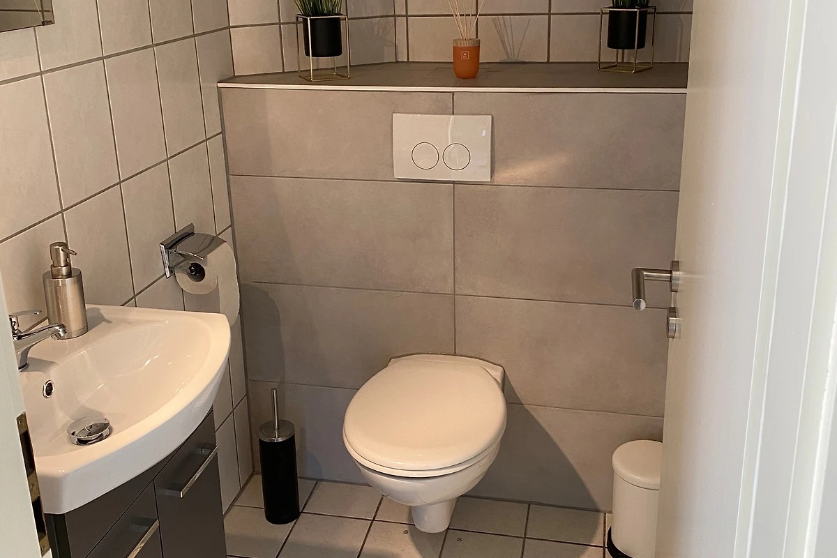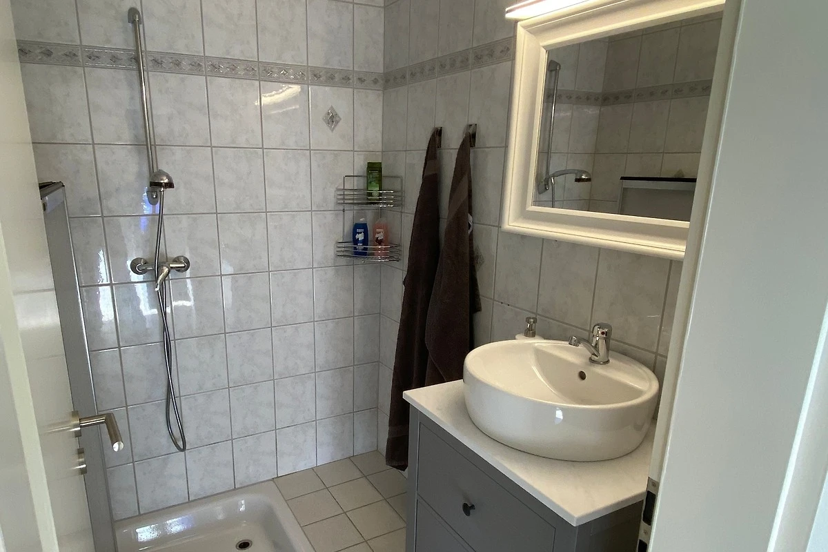 Das Bad hat eine Dusche, und das Wc befindet sich in einem Extra Raum.