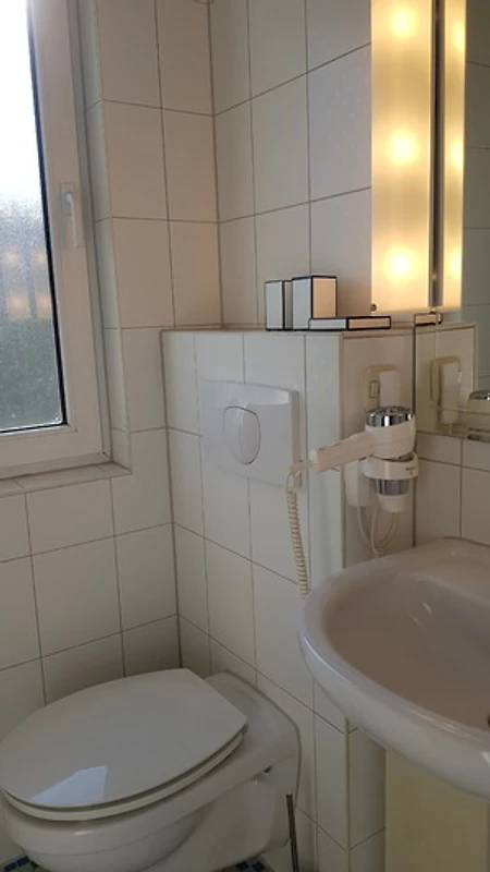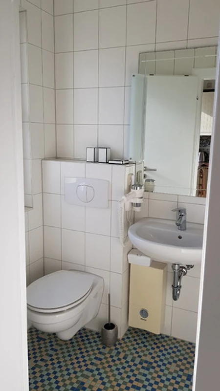 Das geflieste Tageslichtbad verfügt über Dusche, Waschbecken, WC. Hier finden Sie auch eine Waschmaschine und einen Haartrockner.