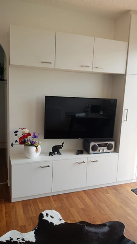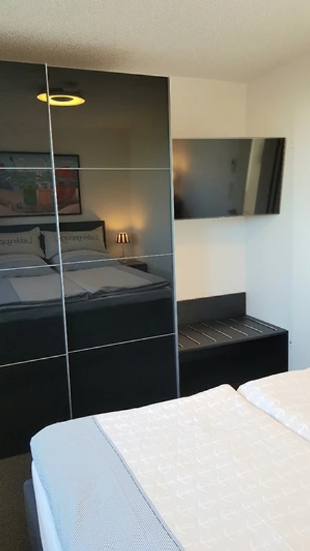 Das Schlafzimmer ist mit einem hochwertigen Boxspringbett von SWISS SENSE, 160 x 200 cm, ausgestattet. Genügend Stauraum, auch für längere Aufenthalte, finden Sie im grossen Kleiderschrank mit Schiebetüren. Auch im Schlafzimmer befindet sich ein Smart-TV neuester Generation. Für Ihr Gepäck befindet sich im Schlafzimmer ausserdem eine Kofferablage. Die Fenster im Schlafzimmer sind mit Verdunkelungsmöglichkeit ausgestattet.