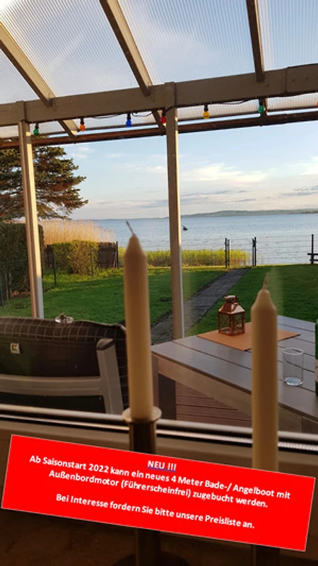 Auf der Terrasse können Sie in bequemen Kettler-Stühlen an einemTisch verweilen und den wundervollen Blick auf den See geniessen, aber auch wunderschöne Sonnenuntergänge bei einem Glas Wein bewundern. Zum relaxen und Seele baumeln lassen haben Sie hier Ihren eigenen Strandkorb .