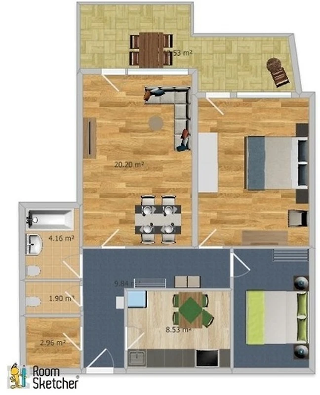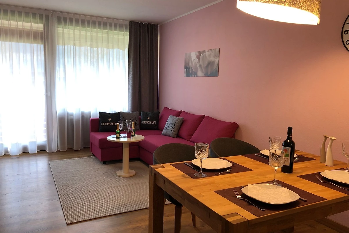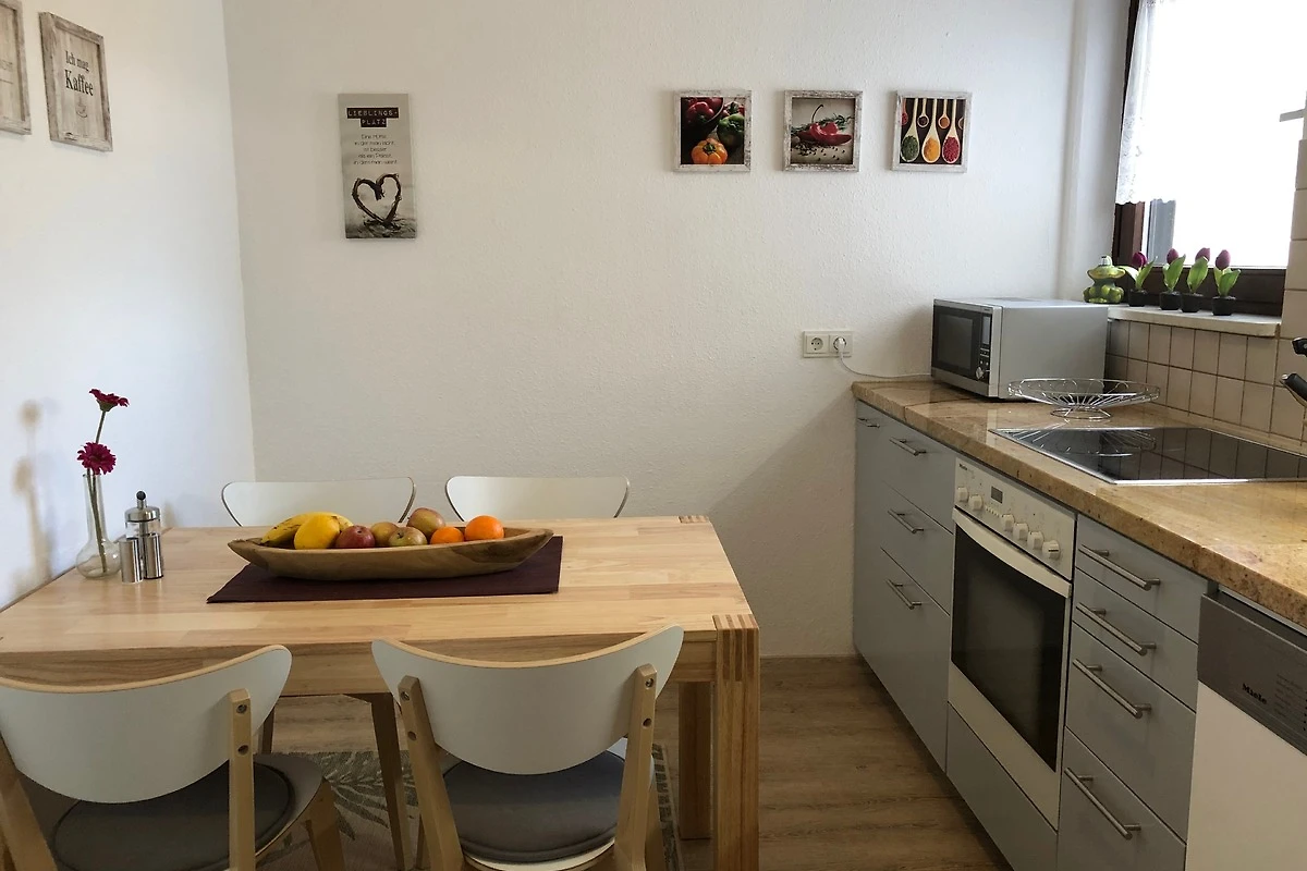 - Bei Belegung mit bis zu 2 Personen stehen Ihnen 1 Schlafzimmer mit grossem Doppelbett (200x180 cm), geräumigem Kleiderschrank und Sessel und Kommode, ein Wohn-/Esszimmer mit zusätzlicher Schlafcouch und Flat-TV, eine voll eingerichtete Küche mit Essecke, ein Wannen-/Duschbad mit Toilette, ein separates Gäste WC, eine grosse (14qm) überdachte Südwest-Loggia zur Verfügung.