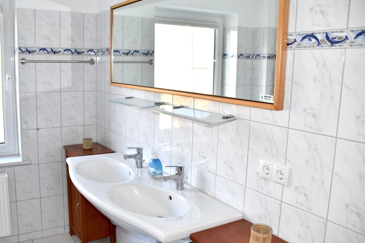 Auf dieser Etage gibt es ein geräumiges Elternschlafzimmer mit einem Doppelbett (180 x 200 cm) und einen Etagenbett (90 x 200 cm). Ein weiteres Elternschlafzimmer ( Doppelbett 180 x 200 cm) mit Blick in den Garten Richtung Parkanlage "Brunnenaue". Ein weiteres Schlafzimmer für weitere 2 Gäste (Doppelbett 180x200 cm). Auch haben Sie ein grosses Bad mit Badewanne, Dusche, zwei Waschbecken und Fön. Alle Wohn- und Schlafzimmer haben Fenster mit Sonnen- und Insektenschutz.