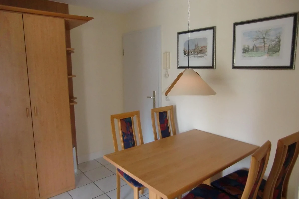 Die Ferienwohnung im "WITTHUS", Hansastrasse 8, Wohnung 07, begeistert durch ihre ideale Aufteilung und Grösse, ideal für einen Aufenthalt mit bis zu zwei Kindern. Im Wohnzimmer befindet sich ein komfortables Schlafsofa für zwei Personen sowie ein grosser Schrank. Das Schlafzimmer bietet ein Doppelbett (2x 80 x 200 cm) und einen geräumigen Kleiderschrank, ergänzt durch Verdunklungs-Plissees. Die Essdiele ist mit einem Esstisch und vier Stühlen ausgestattet und verfügt ebenfalls über einen grossen Schrank für zusätzlichen Stauraum. Die gefliesten Böden sind pflegeleicht. WLAN ist verfügbar, jedoch ohne Gewährleistung bei technischen Problemen. Eine Waschmaschine und ein Trockner stehen im Keller zur Verfügung (kostenpflichtig). Der Zugang zur Tiefgarage erfolgt über die Neue Bergstrasse 7. Haustiere sind nicht gestattet, und Rauchen ist nur unter bestimmten Bedingungen auf dem Balkon erlaubt.