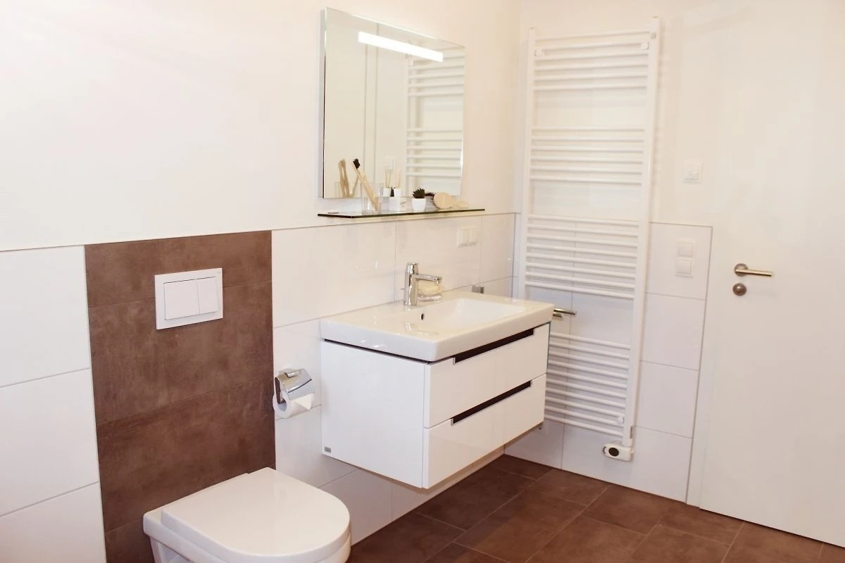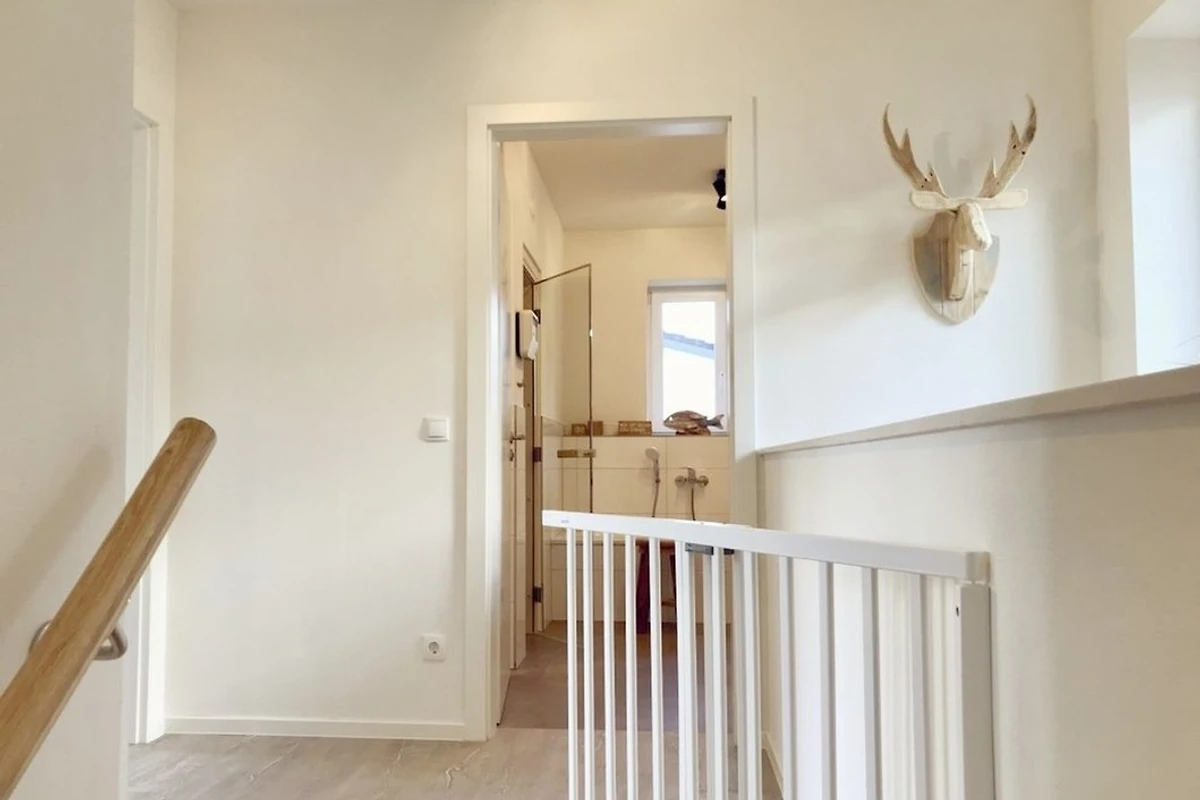 2 Schlafzimmer mit Boxspringbetten erwarten Sie im Obergeschoss. Für unsere kleinsten Gäste auf Wunsch auch ein Reisebett und weiteres Equipment. Das Sofa im Wohnzimmer kann schnell in einen zusätzlichen Schlafplatz verwandelt werden. Somit bietet das Haus Platz für bis zu 5 Personen. Im hochwertigen Wellnessbad mit Sauna haben Sie die Wahl - die kalte Dusche nach dem Saunagang ist ebenso möglich wie ein ausgiebiges, warmes Schaumbad.