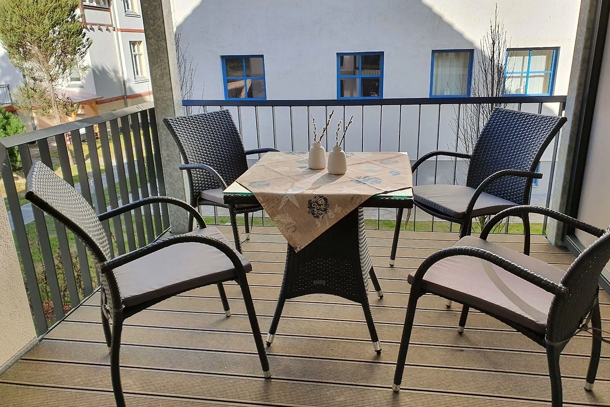 Zur Wohnung gehört ein Balkon zur Nordseite, welcher zum Verweilen und Entspannen nach langen Strandspaziergängen oder einem Shoppingtag einlädt.