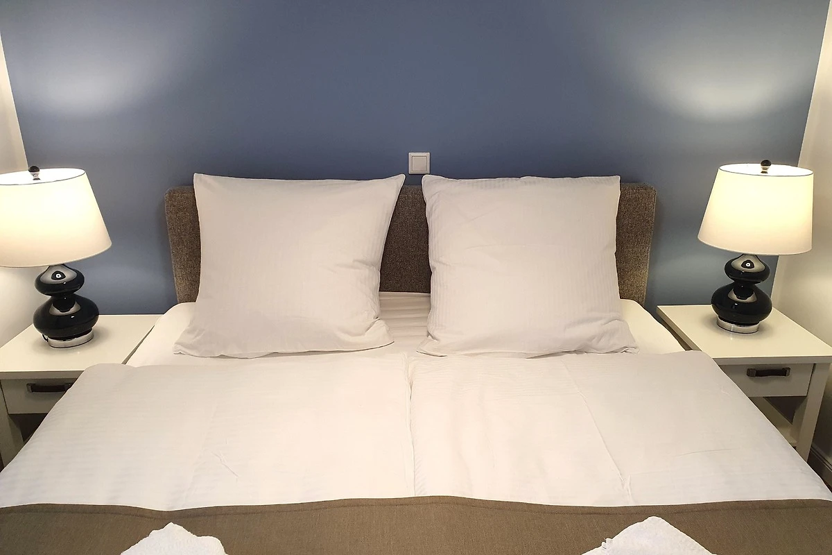 Beide Schlafzimmer sind mit einem grossen, bequemen Boxspringbett (1,80 m Breite) für zwei Personen und einem geräumigen Kleiderschrank mit vielen Ablagemöglichkeiten für Ihre Garderobe eingerichtet.
