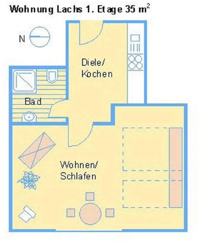 Sie besteht aus einem Wohn-Schlafraum, einer Küche und einem Duschbad