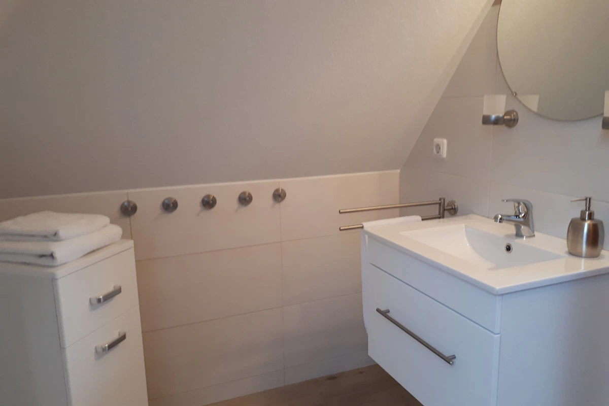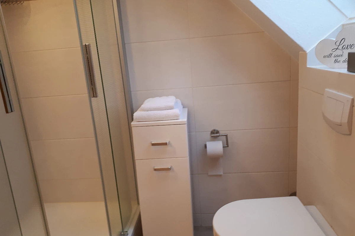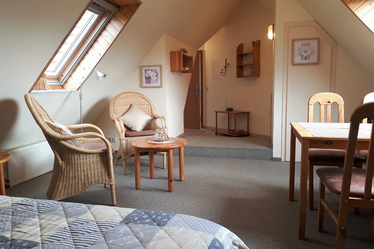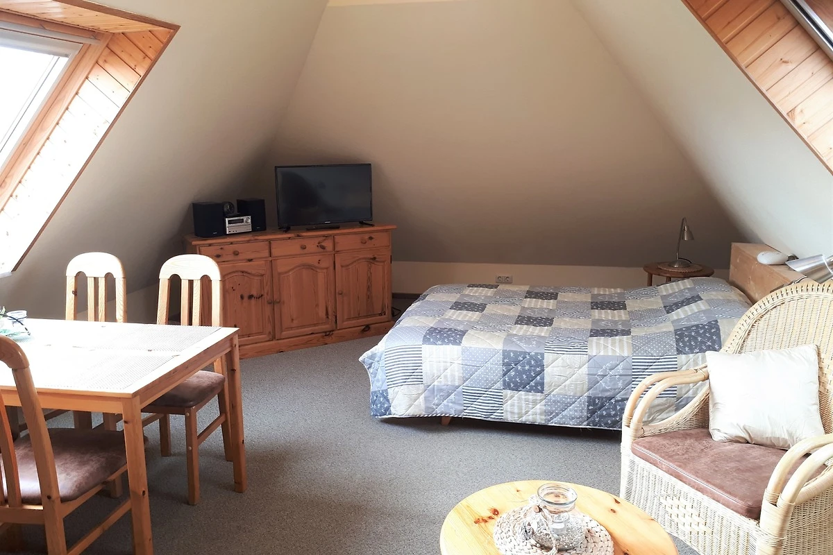 Die Ferienwohnung ist im Dachgeschoss .Sie hat Farb-TV mit Sat.-Anschluss, Internet über WLAN-Hotspot, DVD Player und Stereoanlagen.