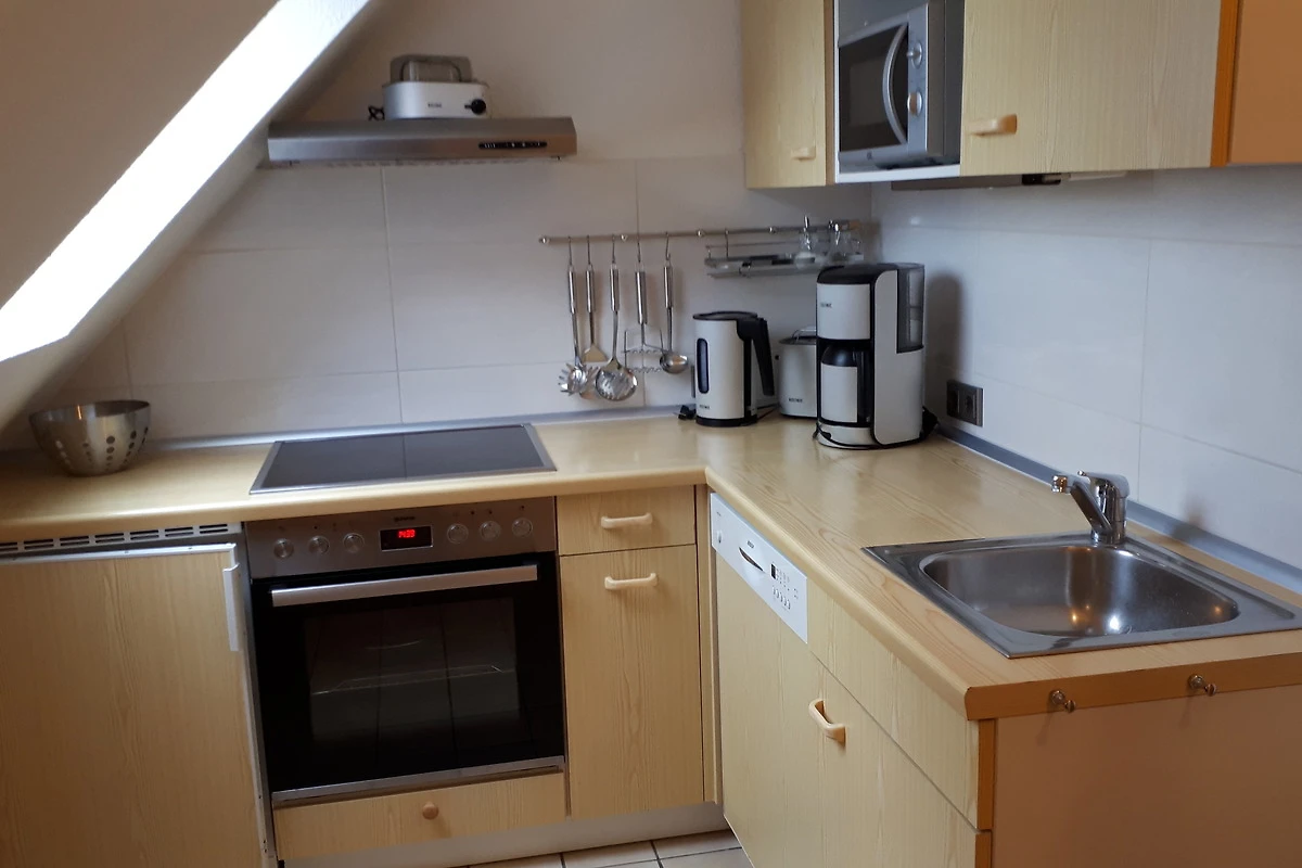 Die Küche ist komplett mit Geschirr, Backofen, Mikrowelle, Geschirrspüler, Kaffeemaschine, Mixer, Wasser- und Eierkocher ausgestattet.