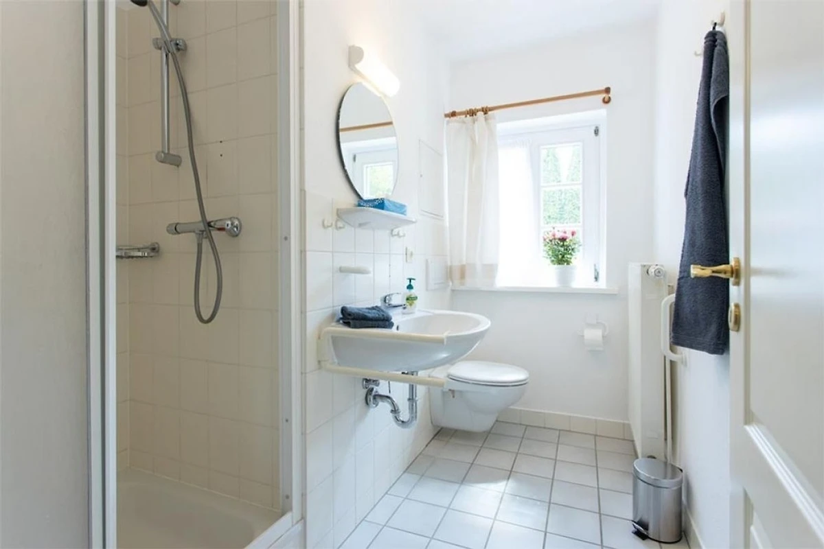 Zur Badausstattung gehört Folgendes: Dusche, Handtücher, Haartrockner.