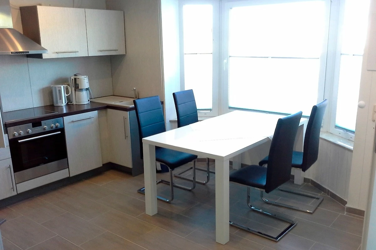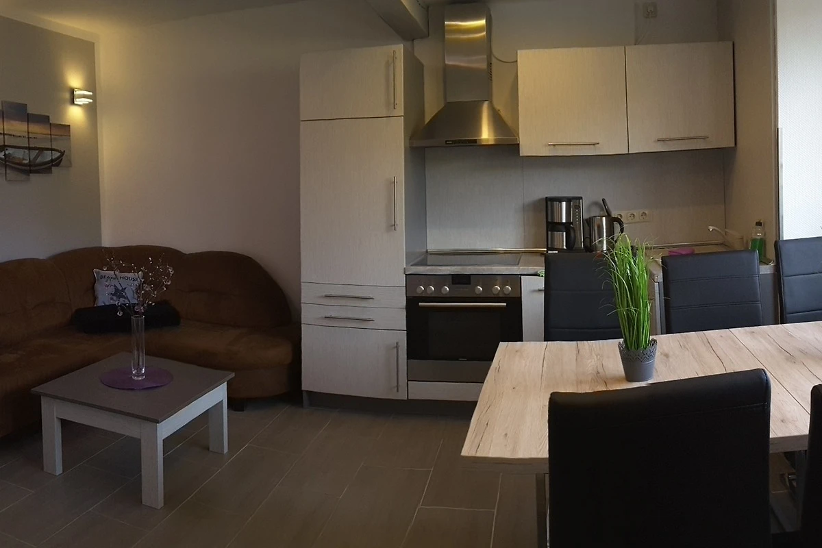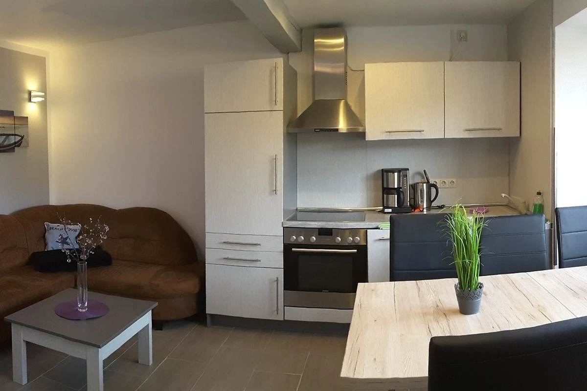 Die offene Pantry-Küche befindet sich auch im Wohnraum, ausgestattet mit Geschirrspüler, Kühlschrank mit Tiefkühlfach, Herd mit Backofen, Kaffeemaschine, sowie Geschirr, Besteck und Kochtöpfe. Für eine wohlige Wärme im Wohnraum sorgt eine Wandheizung.