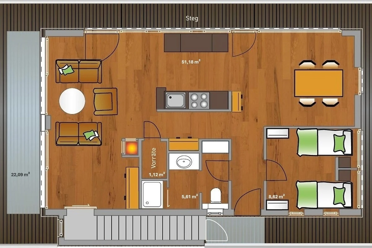 Über zwei Etagen bieten Ihnen rund 120 m² Wohnfläche jeglichen Komfort mit zwei Schlafzimmern für insgesamt 4 Personen, eine offene Küche, zwei luxuriöse Badezimmer, Essbereich, Wohnbereich mit Kaminofen sowie eine Infrarotsauna. Die Möbel sind in modernem, skandinavischem Design gehalten, die gehobene Ausstattung des gesamten Hauses lässt keine Wünsche offen und bietet Ihnen jeden Komfort für die wichtigste Jahreszeit - Ihren Urlaub.